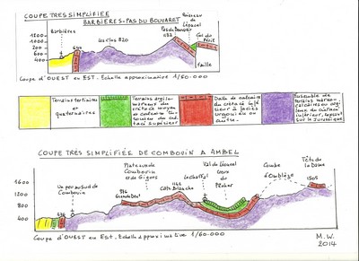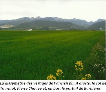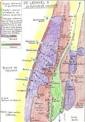 « De Léoncel, on gagne facilement la plaine de Valence ». Certes ! Mais le relief du sud ouest du Vercors n’est pas aussi simple que cette fréquente affirmation pourrait le laisser croire. Il n’est pas superflu de décrire un peu cet espace qui sépare l’abbaye de la plaine dans laquelle elle s’est fortement implantée. De la latitude de Gigors à celle de Beauregard-Barret, le pli le plus occidental du Vercors, essentiellement armé, comme une bonne partie du massif par la carapace de calcaire à faciès URGONIEN, a été sérieusement attaqué par l’érosion. Ce faciès doit son nom au village d’Orgon dans les Alpilles. Voisins de l’étage essentiel du BARREMIEN, ceux de l’Aptien et du Bédoulien possèdent aussi ce faciès. Vers le sud du Vercors, à proximité de l’ancienne fosse vocontienne dans laquelle se sont constituées des couches moins résistantes, le faciès urgonien laisse sa place à d’autres, moins résistants.