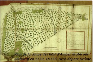 Dom Périer s’appliqua à suivre de façon rigoureuse les recettes et les dépenses de l’abbaye, entreprit de rembourser les dettes et, pour y parvenir chercha à tirer parti de la richesse forestière du domaine montagnard. Dès 1739, il proposa au duc de Tallard, seigneur du Mandement de Saint-Nazaire, heureux de cette initiative, de vendre des coupes de bois dans l’espace indivis entre l’abbaye et le seigneur laïc, espace défini par la draille des moutons entre le col de la bataille et le col de Toulau, puis le très connu scialet de la Chomate et, en ligne droite, le Pas de l’Aubasse. Le marché fut conclu à Grenoble entre d’une part les copropriétaires et d’autre part, pour les 2/3 de l’opération Antoine et Joseph Blanc, père et fils, et pour un tiers avec Guillaume Roybet, tous métallurgistes à Saint Laurent en Royans. Mal renseigné, sans doute, Périer accepta le plan établi par Jean Baptiste Bœuf en 1739, qui, englobait fâcheusement des espaces relevant du Mandement d’Eygluy, également indivis, mais entre le seigneur d’Eygluy et l’abbaye. Le marché ayant été renouvelé en 1755, et l’erreur persistant, on allait assister à une réaction de la part du seigneur d’Eygluy que l’héritière du duc de Tallard, Madame de Sassenage, dédommagea à l’amiable, mais assez lourdement (7000 livres !), ce qui permet d’imaginer l’importance des recettes forestières. On pourrait s’étonner aussi qu’en dépit de la visite à Léoncel en 1726 de la Commission pour la Restauration des forêts, le prieur de Léoncel fasse si peu de cas de ses recommandations et exigences. De fait, dès 1756, la Maîtrise des Eaux et Forêts de Die et son « Maître particulier » Charles Reymond manifestèrent leur inquiétude. Charles Reymond appartenait à la famille propriétaire de Valfanjouse qui entretenait de très mauvais rapports avec l’abbaye. Au cours d’une visite sur Ambel, il qualifia de « désastre » les coupes vendues par les deux co-seigneurs.