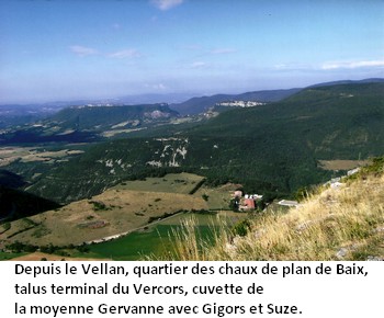 Le Mandement de BAIX , aux contours probablement assez proches de ceux de la commune actuelle s’insinue entre ceux de Gigors et d’Eygluy. Il comprend une partie du couloir entre Côte Blanche et le Vellan, la plus grande partie du Vellan, les quartiers du Vialaret et des Serres et le versant ouest de la vallée de la Gervanne, au sud de la cascade de la Druise qui est pour nous le symbole du passage du Vercors au Diois.