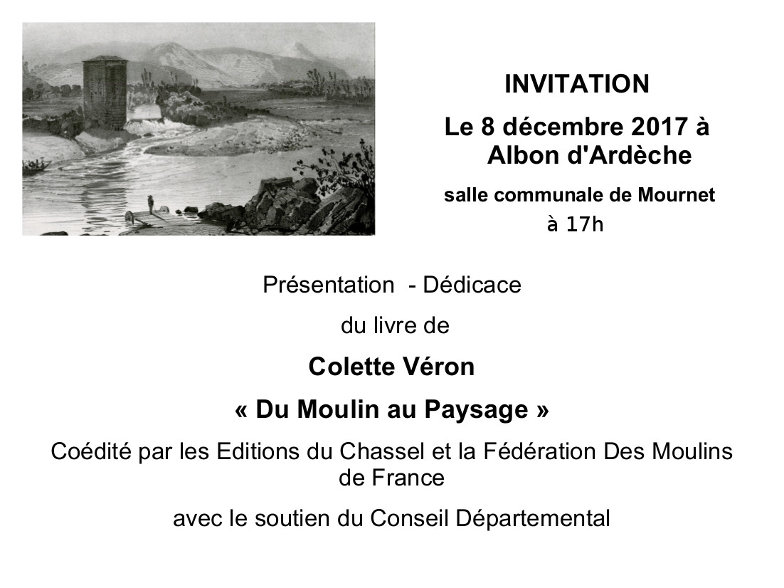Colette Véron, docteur en histoire, auteur d’une thèse intitulée Le moulin hydraulique et son approvisionnement en meules : technique, espace et société en Vivarais du Moyen Age au XIXe siècle, a présenté son nouvel ouvrage dans une conférence-dédicace à Albon d’Ardèche (près de Saint-Pierreville) le 8 décembre 2017. Colette Véron a participé au Cahier de Léoncel n°26, pratiquement épuisé, consacré aux moulins, et est l’auteure de nombreux articles sur le sujet.