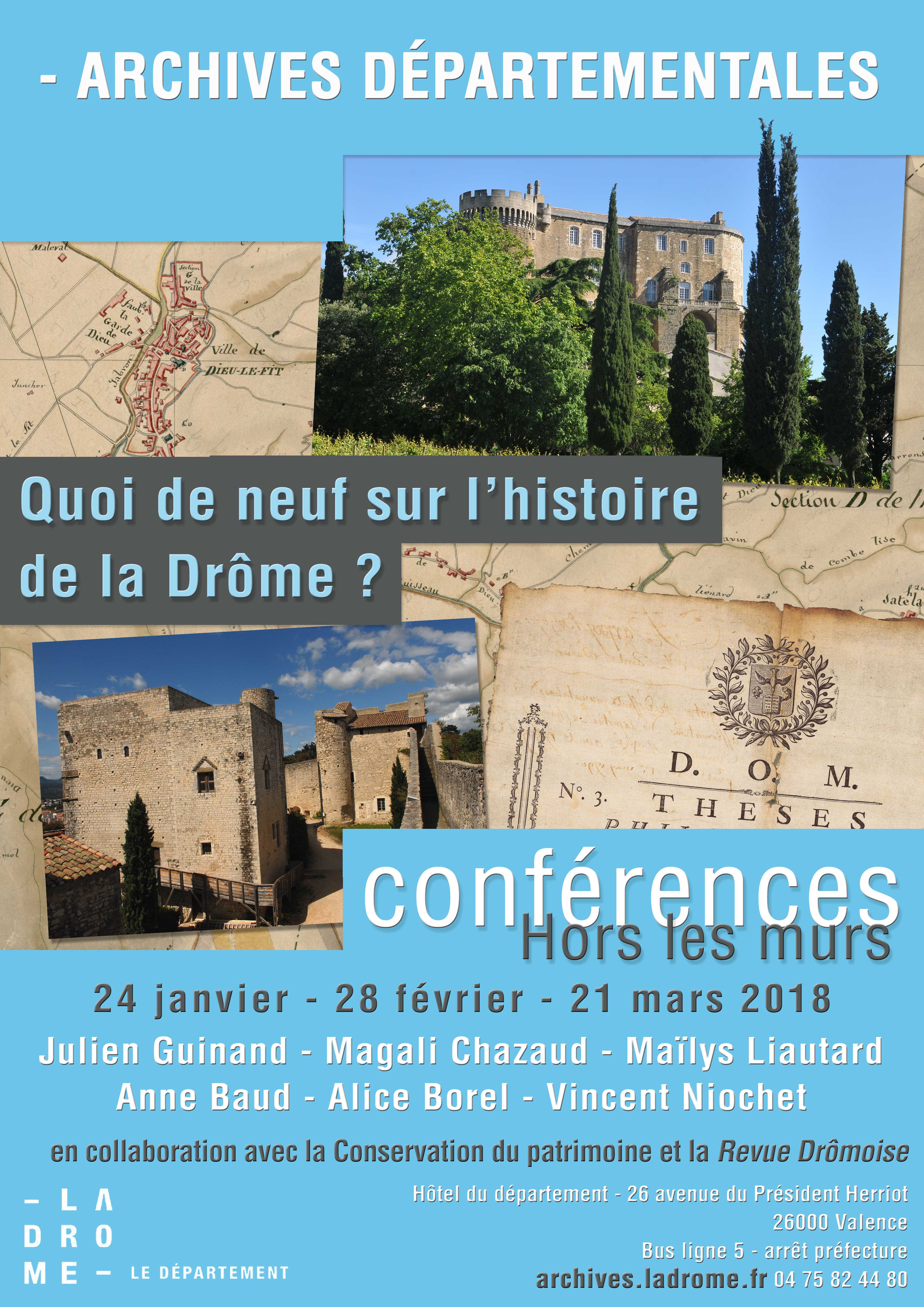 Les Archives de la Drôme ont poursuivi, hors les murs, le cycle de présentation des travaux des jeunes chercheurs en sciences sociales lauréats de la bourse du Conseil Départemental. Le 28 février, à 18h30, interviendront à l’Hôtel du Département, à Valence (Salle Maurice Pic):