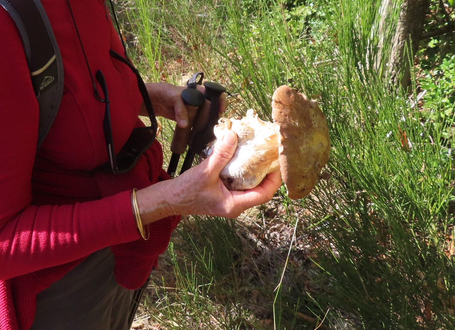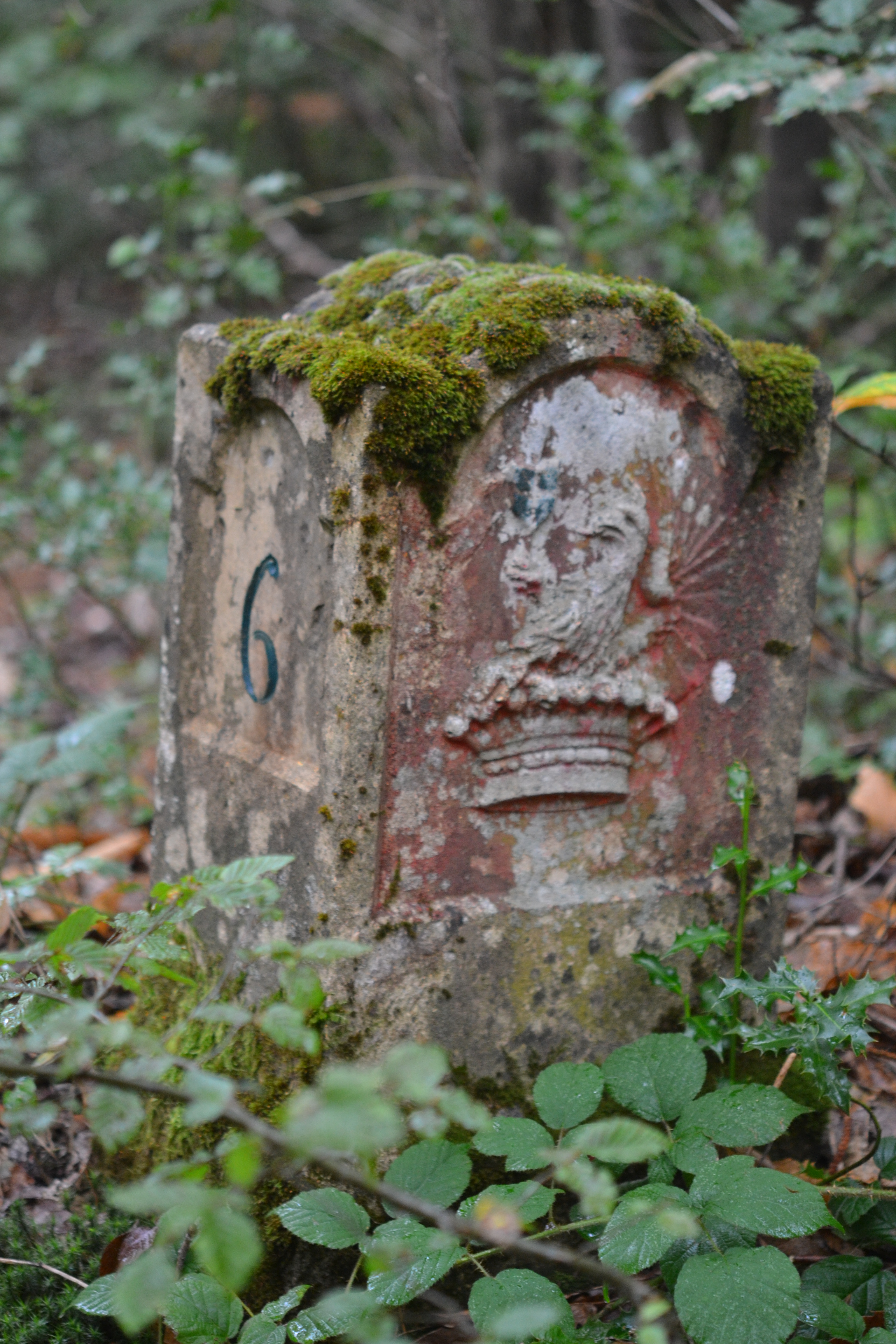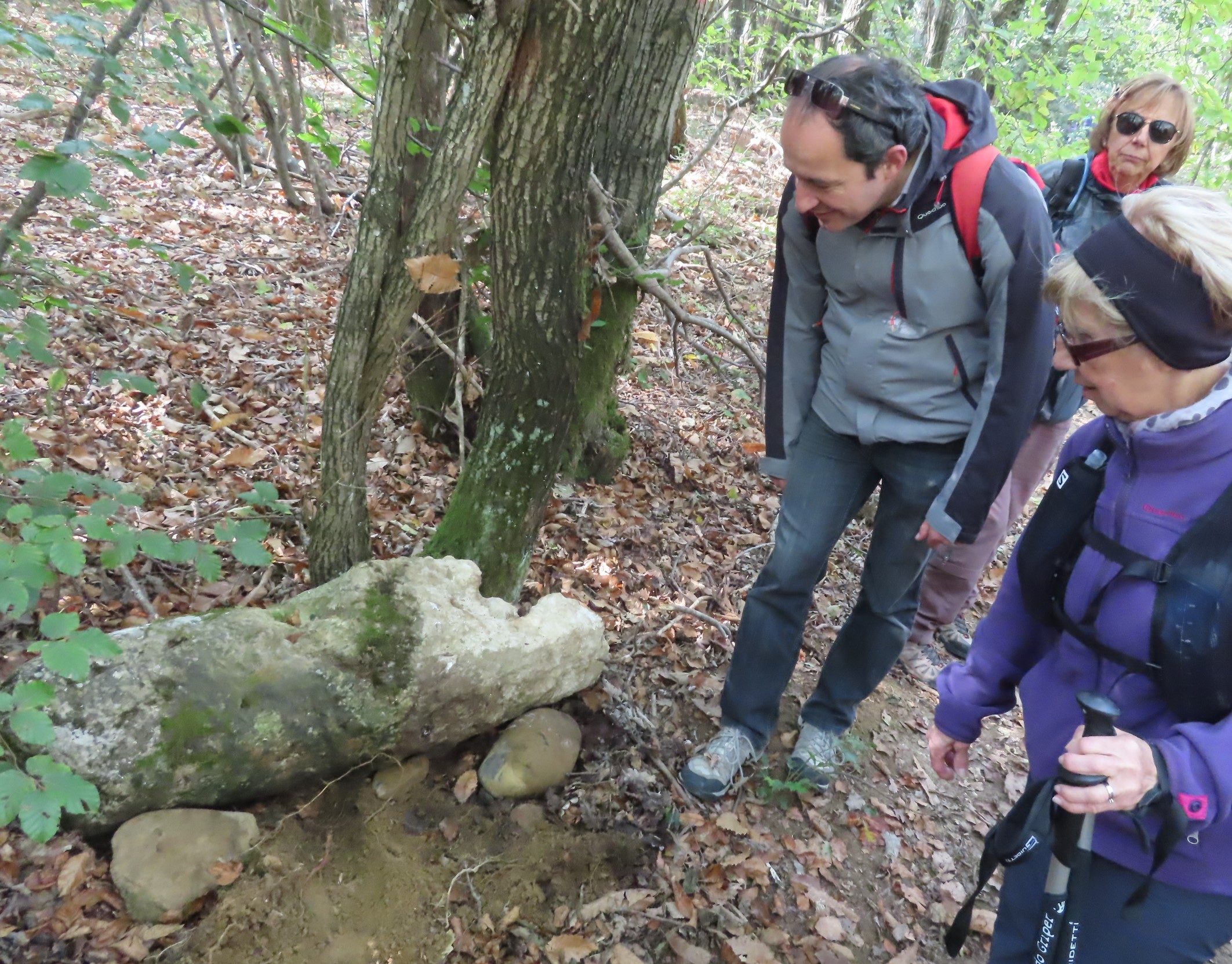 Une borne versée, au bord du chemin : le Président Veyrenche cherche le Tau des antonins. Le Président Maurel évoque les bornages successifs de la forêt.