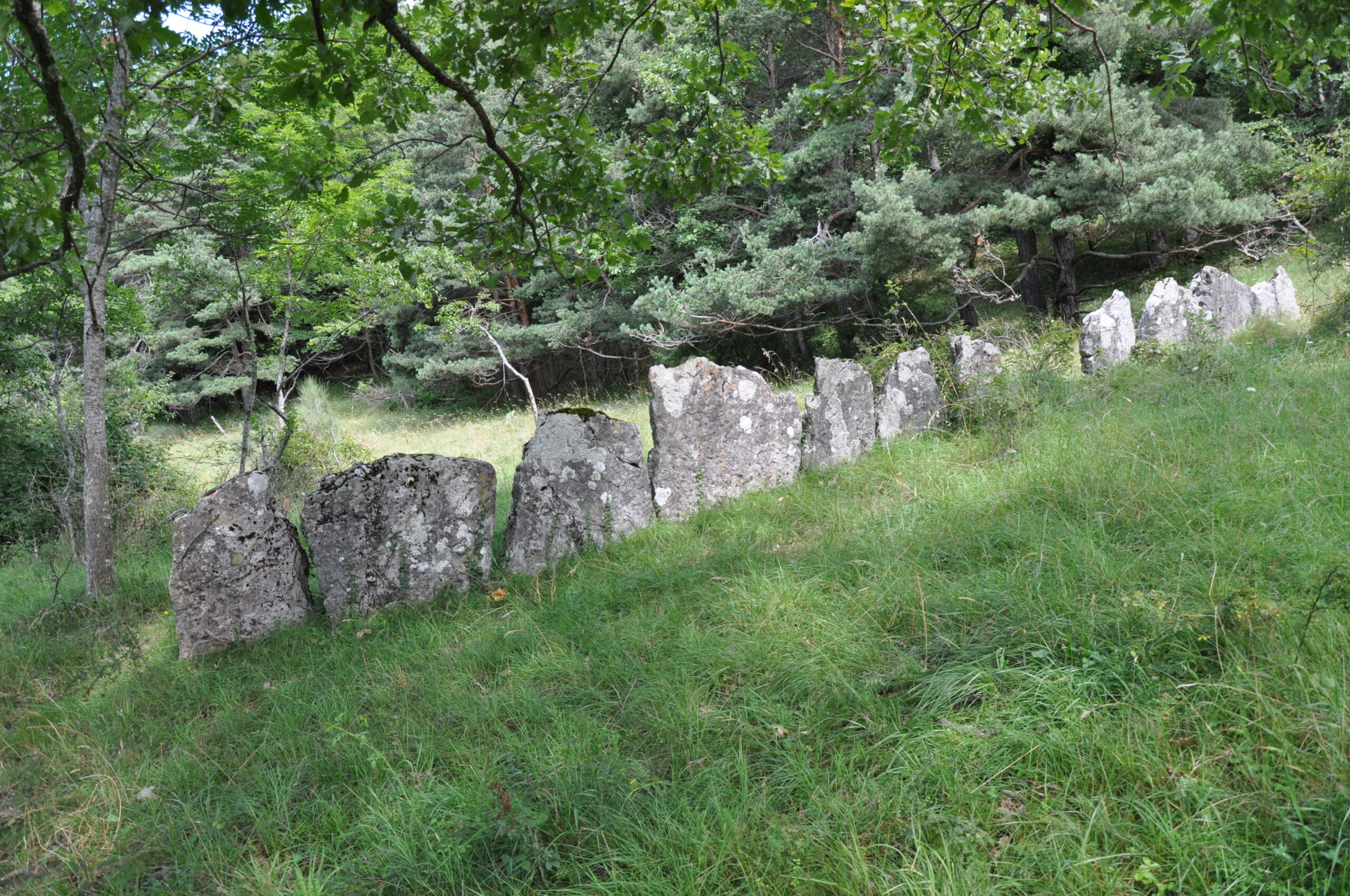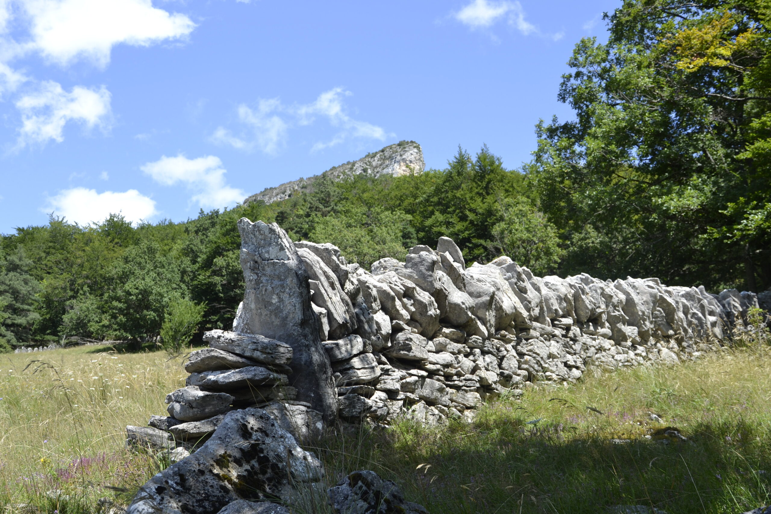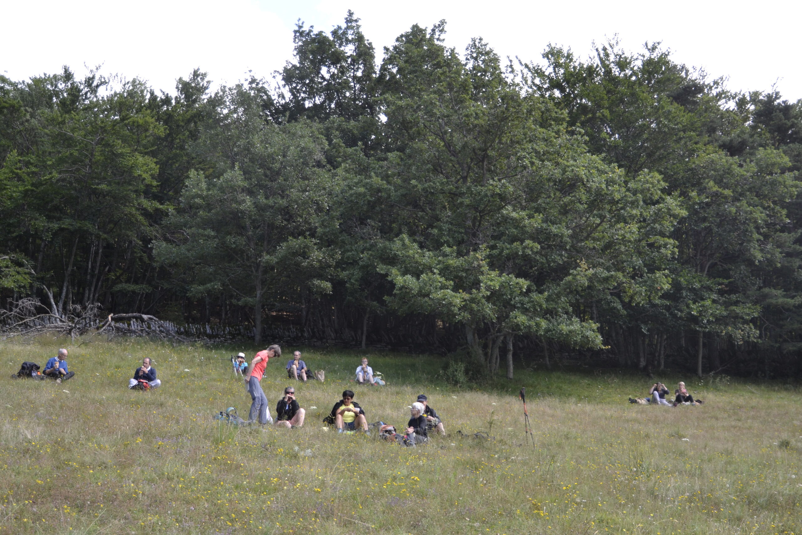 Repas dans les prés du Pêcher, enclos de murs de pierres sèches et de pierres levées.