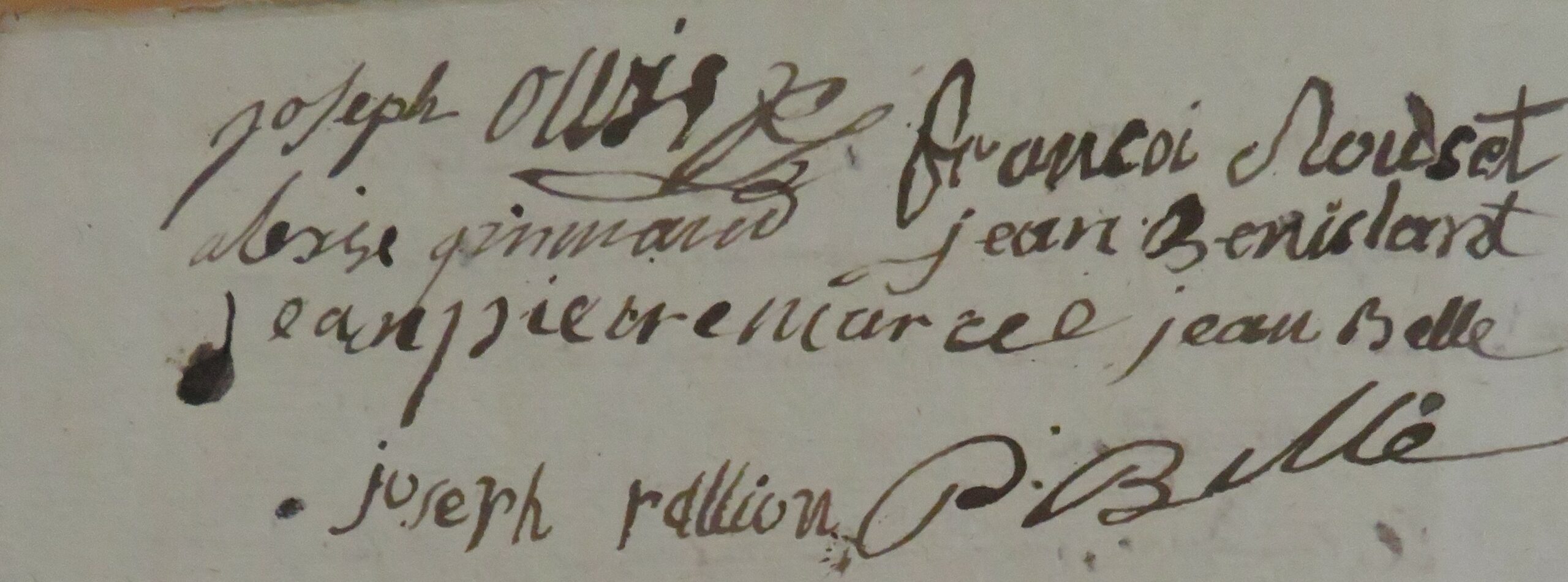 Benistand [?] F. / Joseph Ollier f. / Arbod / Marcel / Joseph Bodin / P. Fave / J.P. Ponçon / P. Benistand / J. Grimaud / P. Bodin / J.P. Gresse / J. Benistant / J. Ponçon / C. Grimaud / Gaudin / A. Benistand / Jean Baraquand / P. Ollier / J. Belle / [ ?] Marcel / J. Boi.. [?]/ A. Rousset / J.L. Arbod / A. Didier / A. Fave / P. Ollier / A. Moulain / Isidore Ju… [?] / Marcel / Joseph Pinat / J.P. Benistant / J. Granjon / Eynard / Jean Bodin / Guinard, desservant / Jh Lantheaume