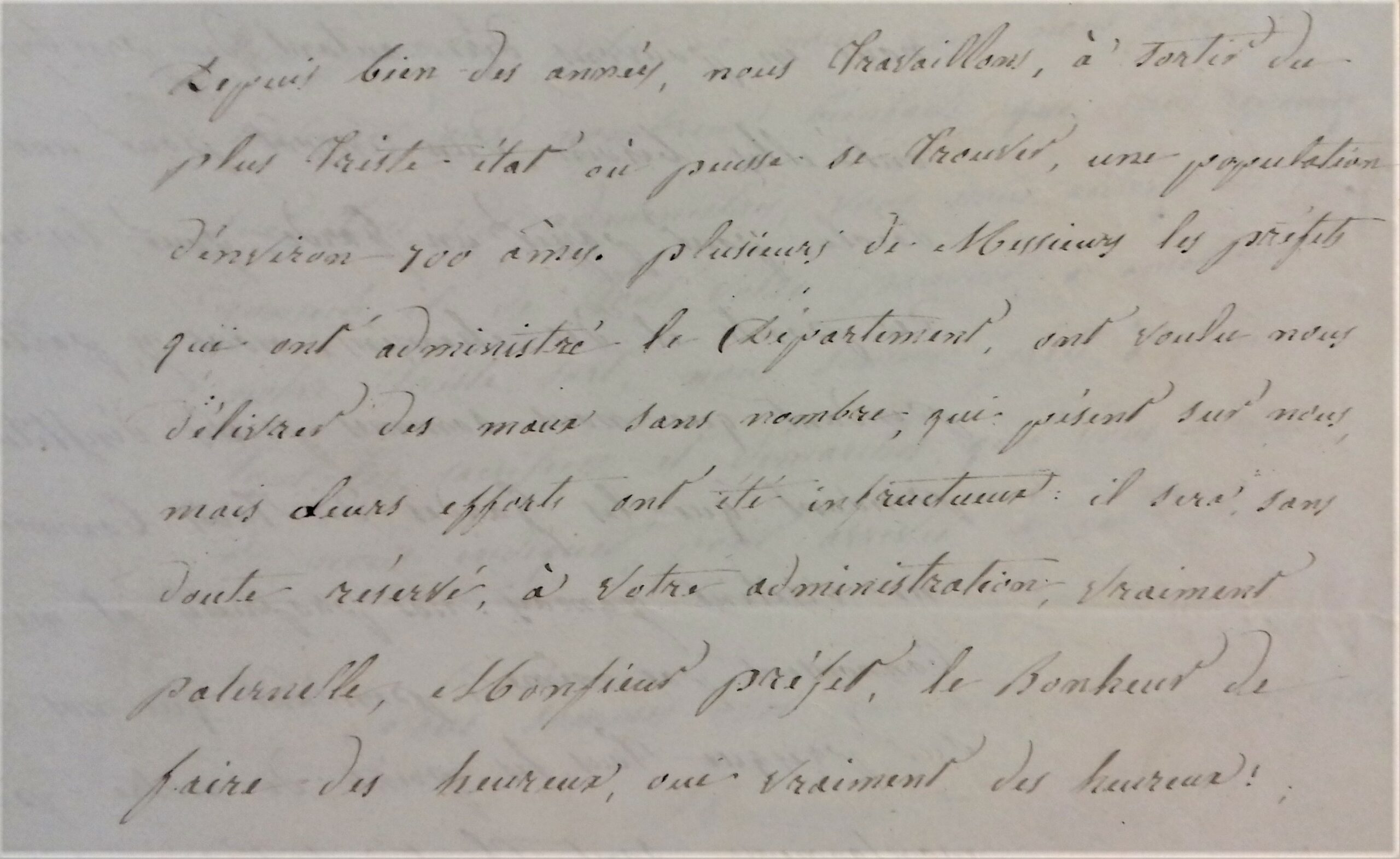 Nous osons donc espérer, Monsieur le Préfet, que vous prendrez pitié de nous, vous nous ferez participer aux nombreux bienfaits que vous répandez sur tous vos administrés, vous nous aiderez de vos conseils et de tout votre pouvoir à améliorer notre triste sort, nous sommes prêts à faire tous les sacrifices et démarches qu’il vous plaira de nous indiquer pour arriver à cette fin.