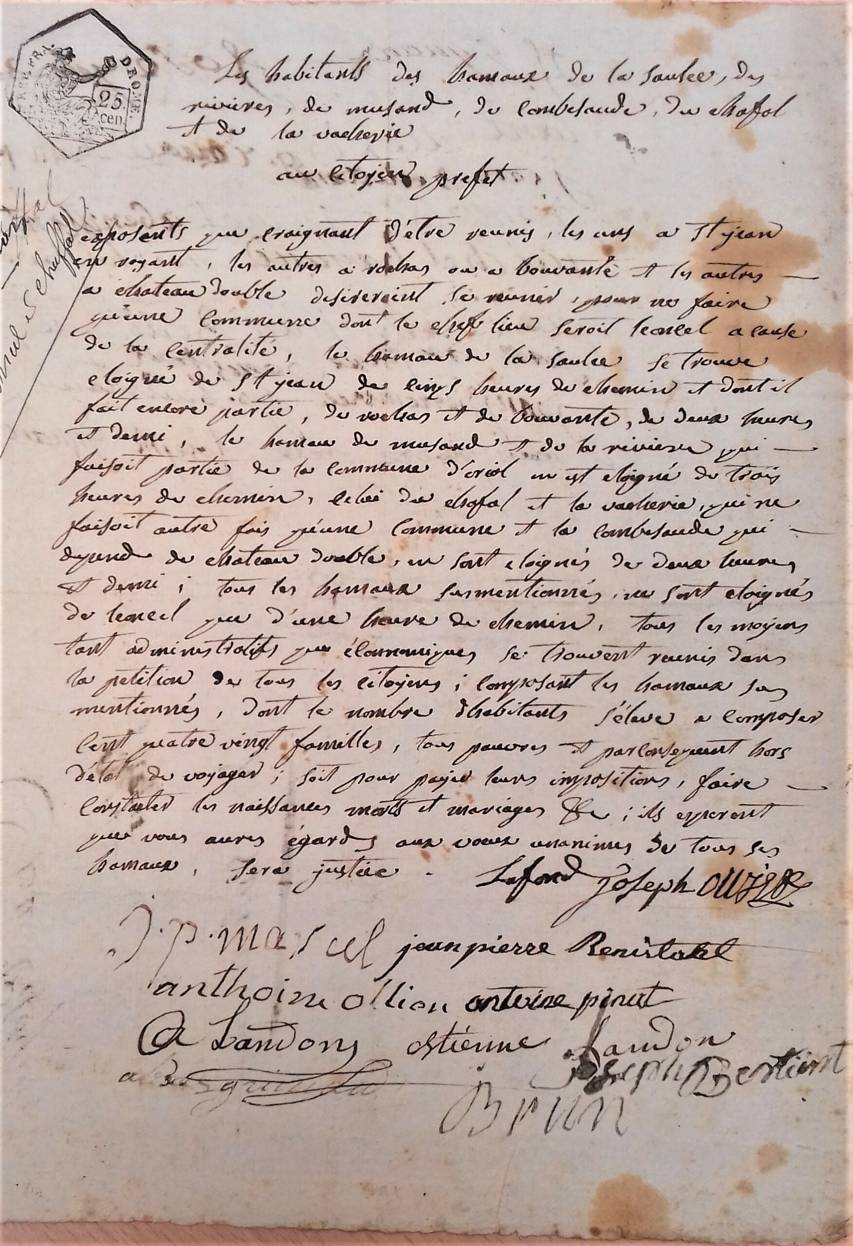 Exposent que, craignant d’être réunis, les uns à Saint-Jean, les autres à Rochas [ ?] ou à Bouvante, et les autres à Châteaudouble, désireraient se réunir pour ne faire qu’une commune dont le chef-lieu serait Léoncel à cause de sa centralité. Les hameaux de la Saulce se trouvent éloignés de St-Jean de cinq heures de chemin et dont il fait encore partie, des Rochas et de Bouvante, de deux heures et demi, le hameau de Musand et de Les Rivières qui faisait partie de la commune d’Oriol en est éloigné de trois heures de chemin, celui du Chaffal et la Vacherie, qui ne faisaient autrefois qu’une commune et la Combechaude qui dépend de Châteaudouble, en sont éloignés de deux heures et demi ; tous les hameaux susmentionnés ne sont éloignés de Léoncel que d’une heure de ce chemin ; tous les moyens tant administratifs que économiques se trouvent réunis dans la pétition de tous les citoyens composant les hameaux  susmentionnés, dont le nombre d’habitants s’élève à composer cent quatre vingt familles, tous pauvres et par conséquent hors d’état de voyager, soit pour payer leurs impositions, faire constater les naissances morts et mariages etc. ; ils espèrent que vous aurez égards aux vœux unanimes de tous ces hameaux, sera justice.