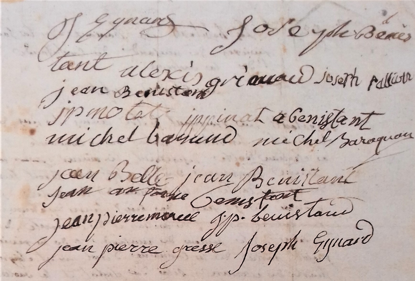 [18]J. Eynard / Joseph Benistant / Alexis Grimaud / Joseph Ollier / Jean Benistand / J.P. Motet / J.P. Pinat / A. Benistant / Michel [illisible] / Michel Baraquan / Jean Belle / Jean Benistant / Jean an [?] Fave / Benistant / Jean Pierre Marcel / J.P. Benistand / Jean Pierre Gresse / Joseph Eynard