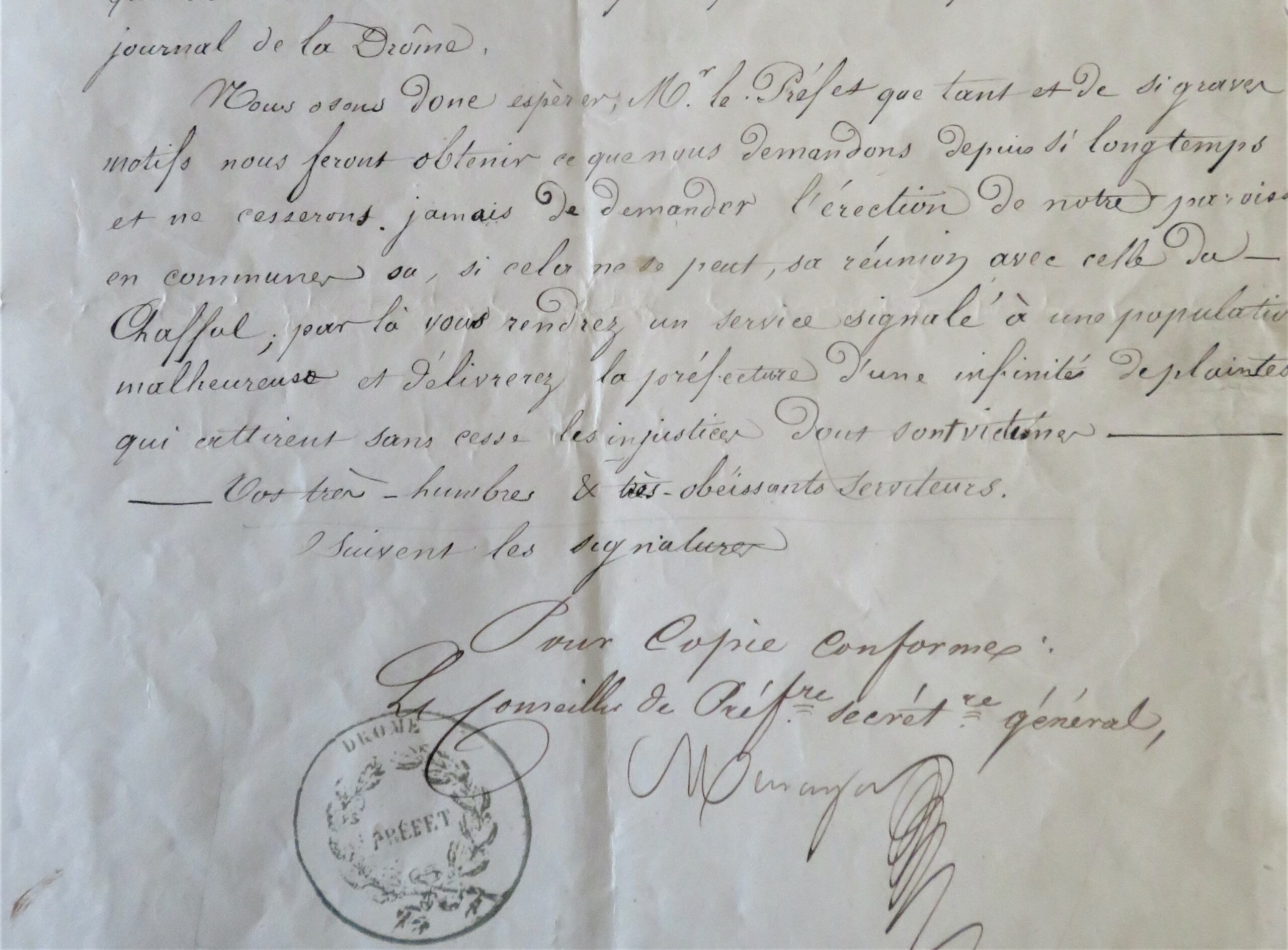 Nous osons donc espérer, Monsieur le Préfet, que tant de si graves motifs nous feront obtenir ce que nous demandons depuis si longtemps et ne cesserons jamais de demander, l’érection de notre paroisse en commune, ou, si cela ne se peut, sa réunion avec celle du Chaffal. Par là vous rendrez un service signalé à une population malheureuse et délivrerez la préfecture d’une infinité de plaintes qu’y attirent sans cesse les injustices dont sont victimes vos très humbles et très obéissants serviteurs.