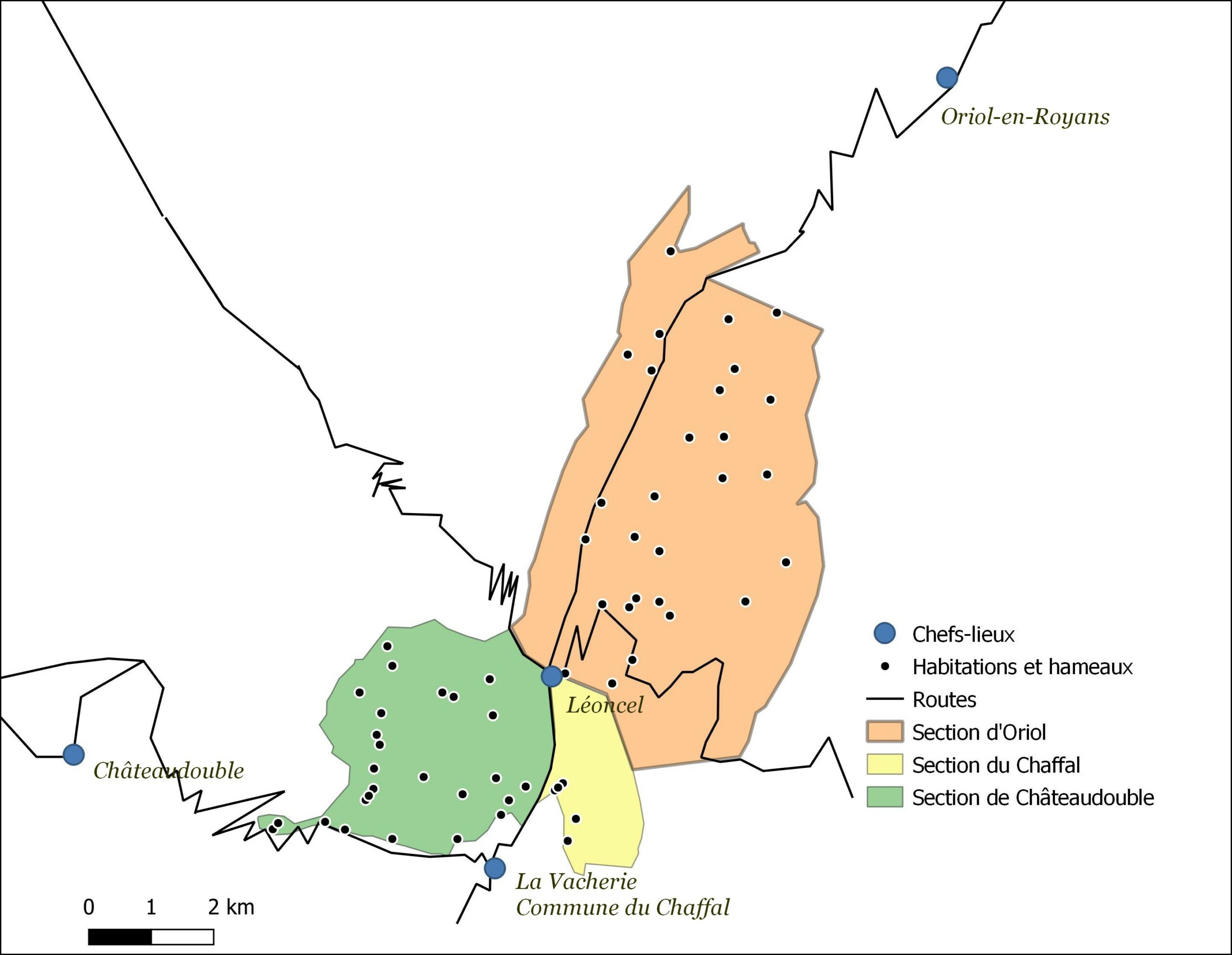 La commune a repris le territoire de la paroisse s’étendant, à l’époque des pétitions, sur trois communes différentes : Le Chaffal, Châteaudouble, Oriol-en-Royans. La carte ci-après montre le territoire communal actuel en trois zones, différenciant l’origine des différents quartiers. On voit que les chefs-lieux de deux communes-mères, Oriol et Châteaudouble, sont difficiles d’accès : excentrés, éloignés, et défendus par des dénivelés notables (l’altitude moyenne des Sausses et des Combes Chaudes est de 1 000 m : Oriol est à 300 m, Châteaudouble à 350 m d’altitude ; La Vacherie et Léoncel sont à la même altitude, 900 m).
