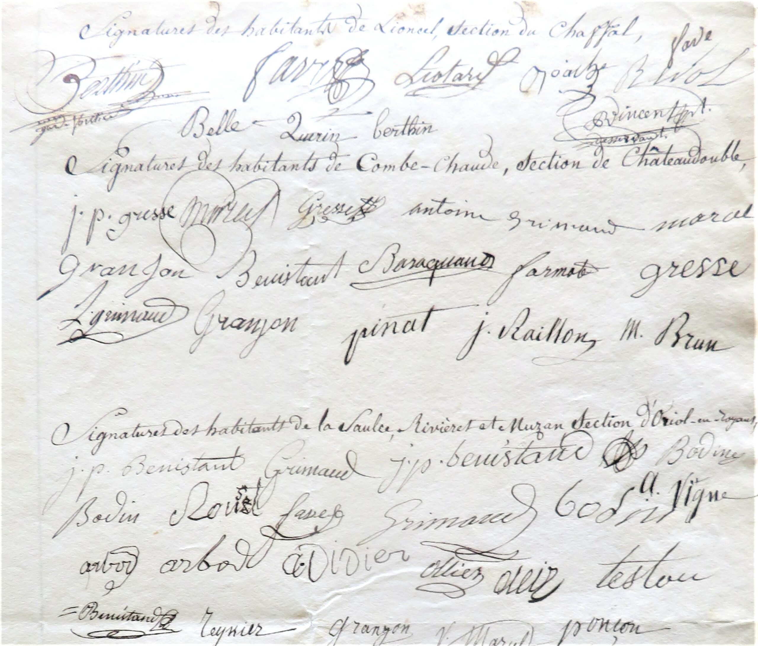 Signatures des habitants de Combe-Chaude, section de Châteaudouble :