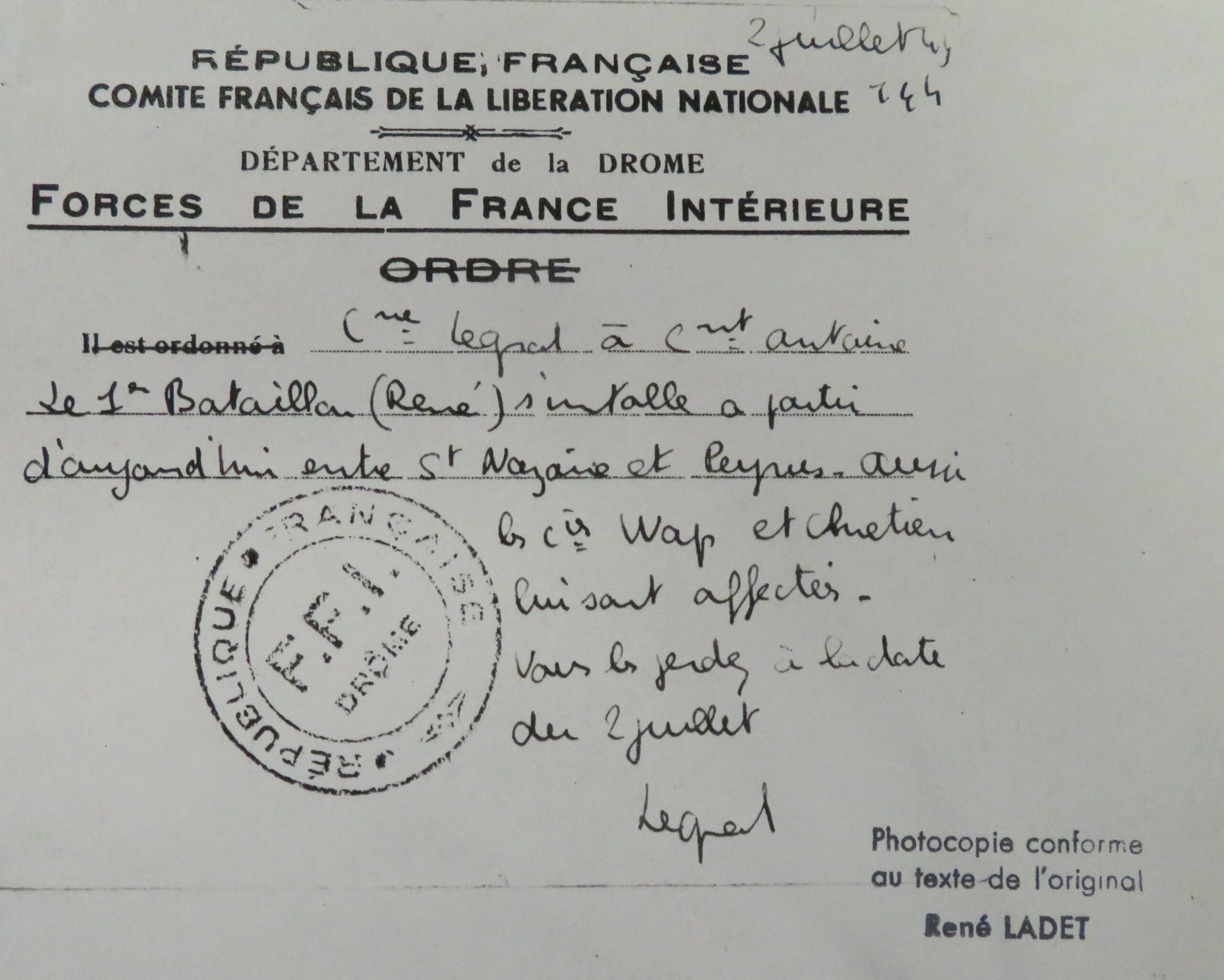• à 14 h 30 : « Lt Chrétien actuellement au PC. Toute sa compagnie repliée par ordres Lt René. J’ai vu ordre donné à 0 h 20 de se disperser après planquage des armes lourdes – Renseignements transmis par Chrétien indiqueraient évacuation complète de Léoncel – Présence des Allemands (plusieurs milliers) vers le col de la Bataille – Liaison René-Legrand par téléphone coupée depuis hier – Liaison par agent pas revenue à René venant de Legrand. Vous demande ordres. » ;