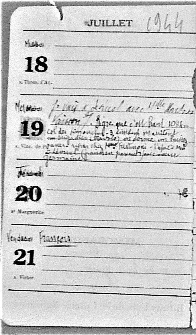Par une coïncidence étrange, ce 19 juillet, Marguerite Verguet, de Valence, avait décidé d’aller à La Vacherie et Léoncel et avait donc pu passer. Mlle Verguet était professeur à l’Ecole primaire supérieure, très engagée dans le mouvement social et politique valentinois ; elle était Résistante, sera membre du Comité départemental de Libération en septembre 44. Son agenda de juillet montre deux passages sur Léoncel. Le premier : “Mardi 19. Je vais à Léoncel avec Mlle Martin Vaisson J. Bigre que c’est haut 1 024 m col des Limouches. 3 dissidents m’arrêtent. un brigadier ([illisible] me donne un laissez-passer. Repas chez Mme Fustinoni. L’après-midi à Léoncel (fraises en passant) [illisible] Germaine.”