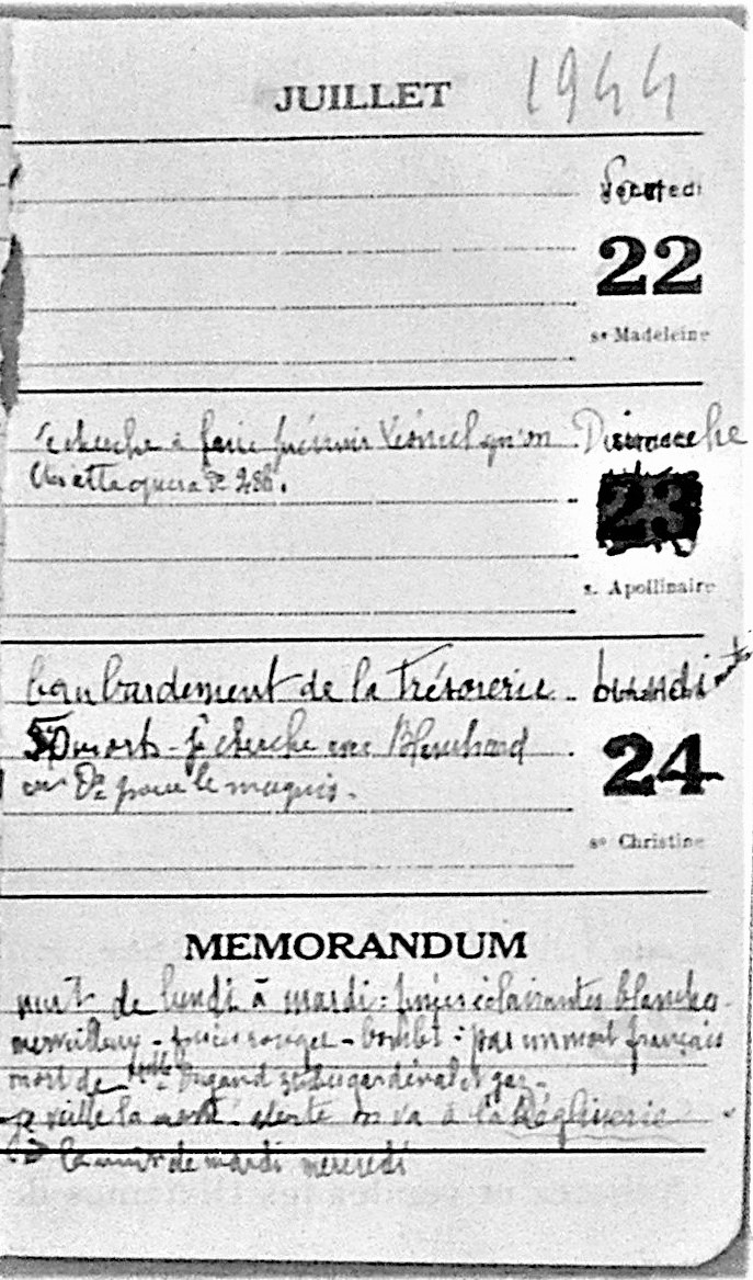 L’agenda de Mlle Verguet pour ce 23 juillet porte une mention sur Léoncel [ADD 411 J 23] : “Je cherche à faire prévenir Léoncel qu’on les attaquera sous 48 h.” Les Résistants de Valence avaient-ils eu connaissance du mouvement décidé de Peyrus sur Tourniol ? auquel cas, leurs sources étaient très efficaces.