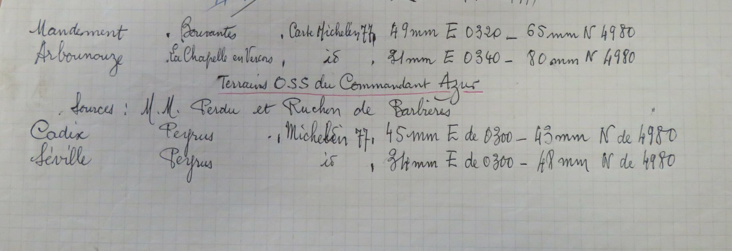 - Le document donne les coordonnées des deux terrains : « Terrains OSS du Cdt Azur – Sources : MM Perdu et Ruchon de Barbières »