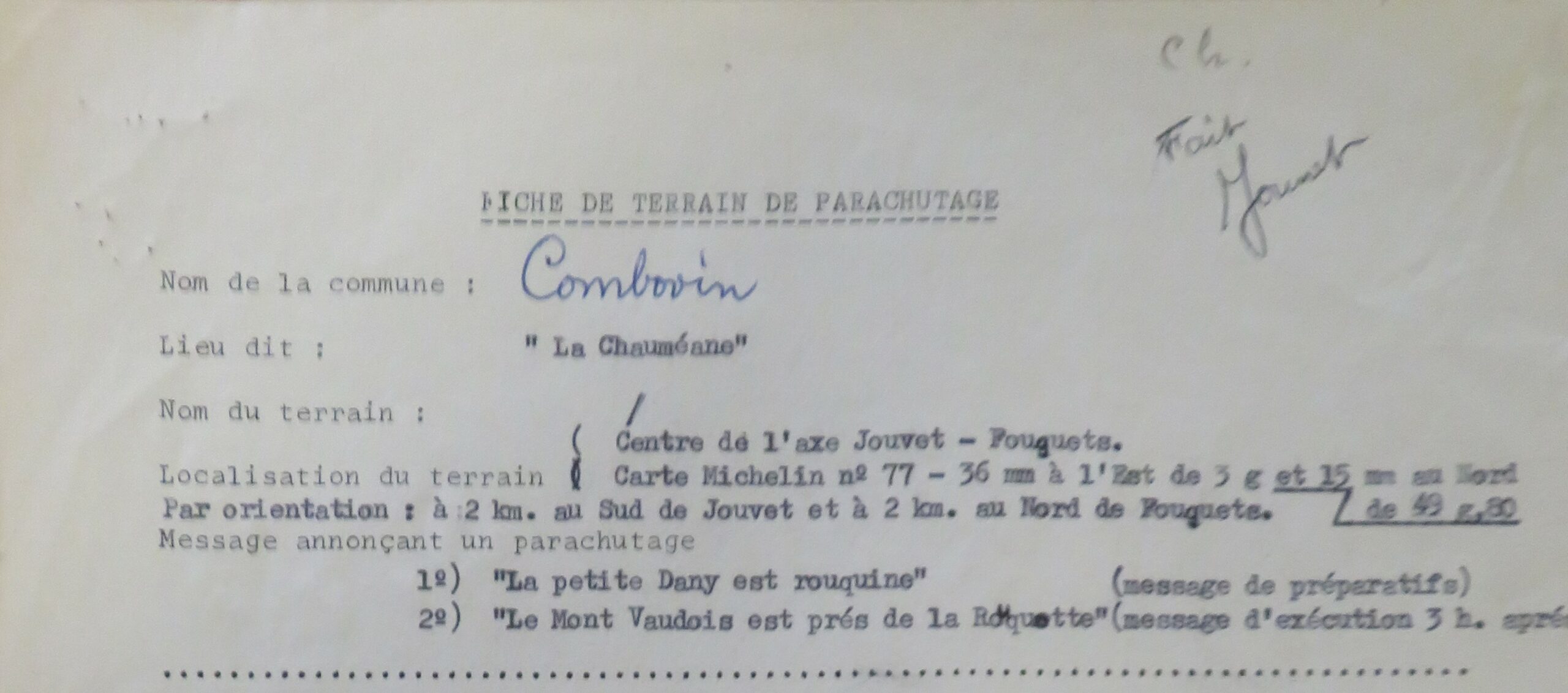 - Le dossier ADD 97 J 1 « Correspondance active du Cdt L’Hermine » contient deux messages du commandant FFI départemental (jusqu’au 3 juillet) évoquant des parachutages. Les terrains mentionnés sont :