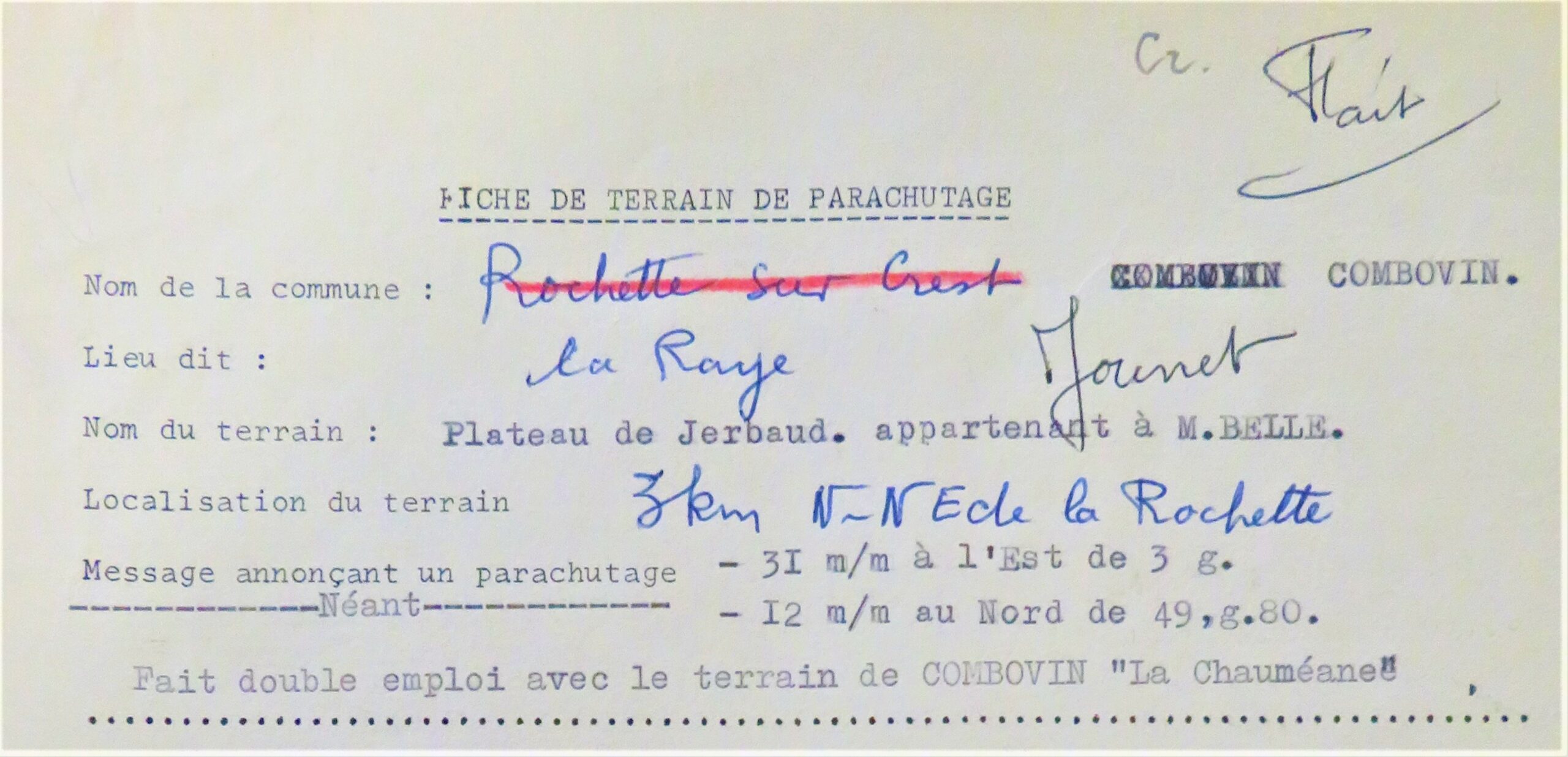 - Un document d’A. Vincent-Beaume porte la mention suivante : « Sources AN-BCRA – Terrain « Jouvet » : Carte Michelin 77 – 30 mm E de O 300 – 15 mm N de 4980 – 9,5 km de Chabeuil. »