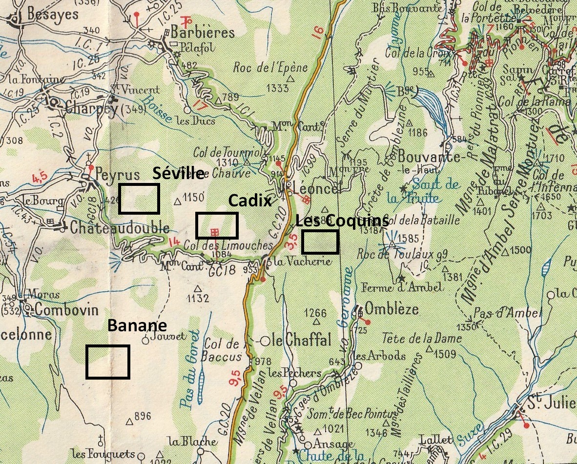 Pour la Cie Wap, le terrain recensé le plus proche est celui des Limouches, « Cadix ». Mais J.P. Bretegnier cite explicitement les parachutages à Combovin, « Banane » : « les parachutages sont très nombreux sur le plateau de Combovin où nous allons chercher le matériel qui nous est destiné. » La période n’est pas précisée. « Cadix » peut avoir été défini après « Banane ».