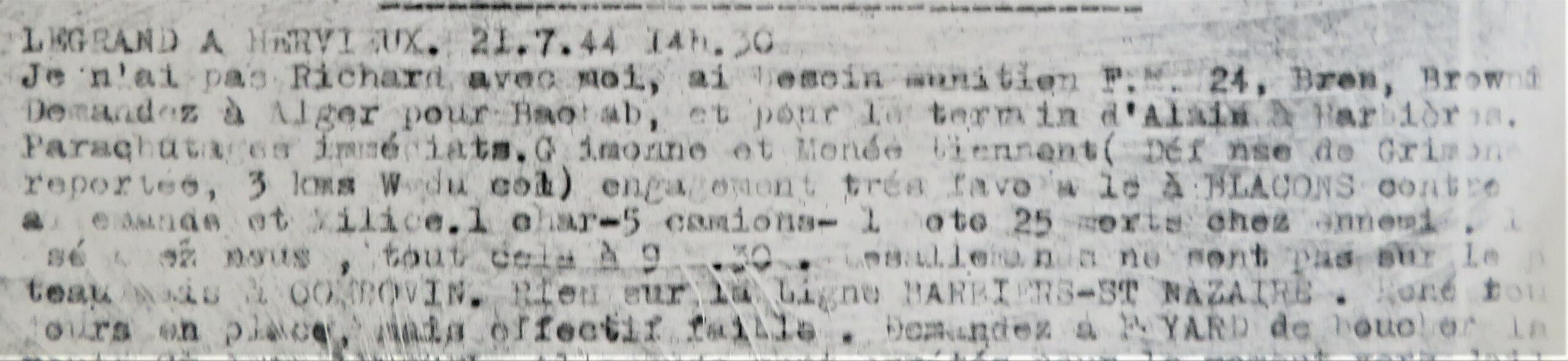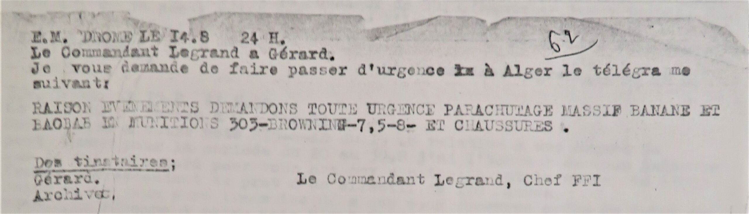 - Le 13 juillet 1944, le Cdt Legrand écrit au Cdt Antoine : « Je pense que vous avez entendu le message vous concernant sur Banane. »