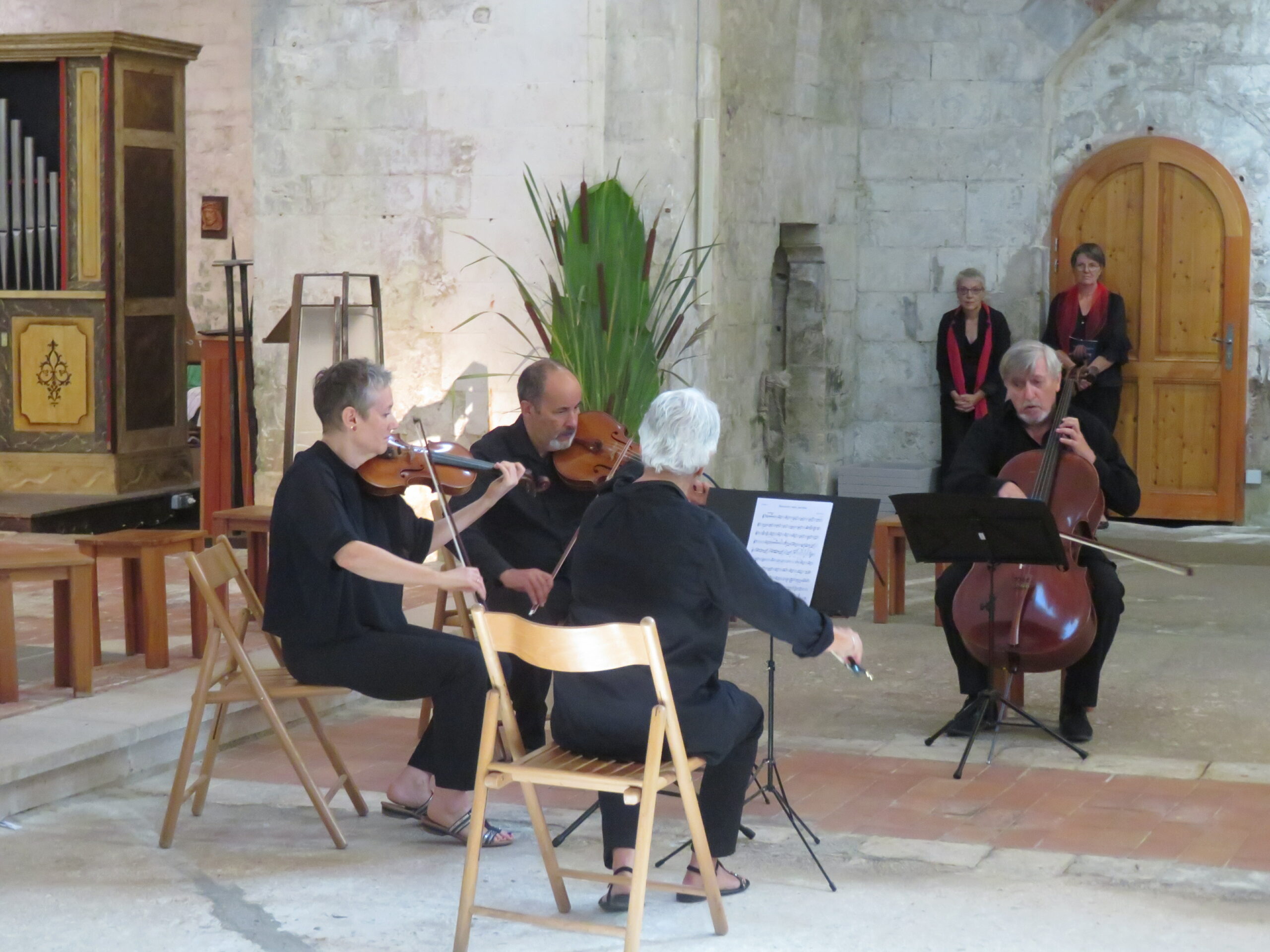 Belle fin de saison musicale pour les Amis de Léoncel : le Quatuor Barratier et le chœur Dolc’e Caldamente ont donné un très beau concert mêlant pièces instrumentales et œuvres chantées.