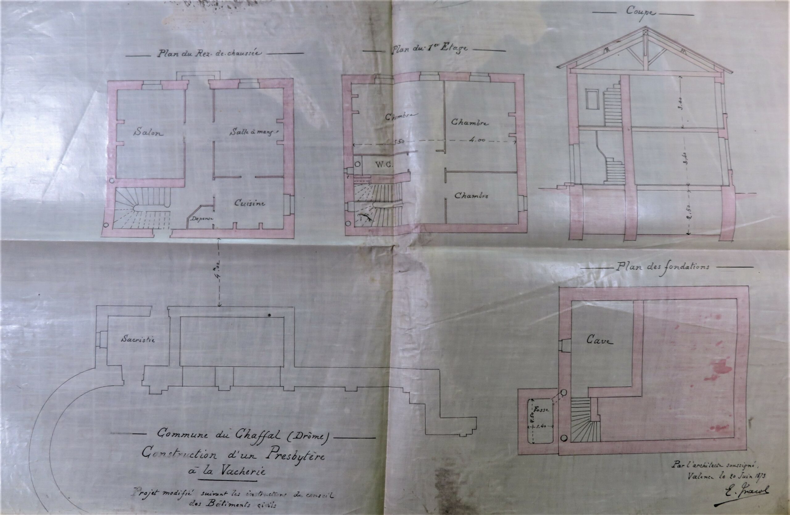 Aucun plan ne figure dans les pièces de 1860 – 1868. Il en existe un dans une chemise sur des travaux réalisés en 1896 (ADD 2 O 169).