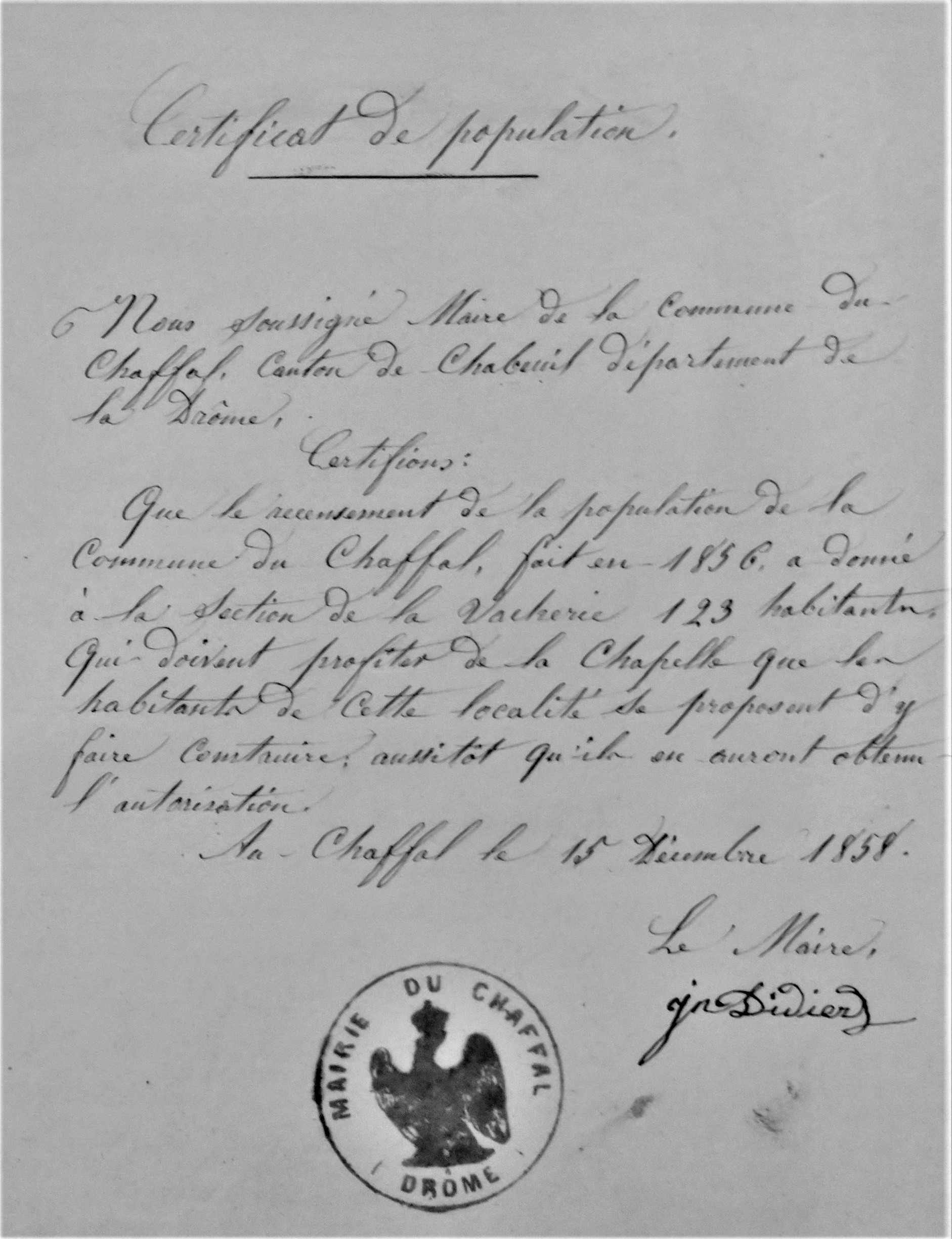 Certificat de population de la section de La Vacherie : 123 habitants sur un total de 187 pour la commune en 1856 (ADD 2 O 169)