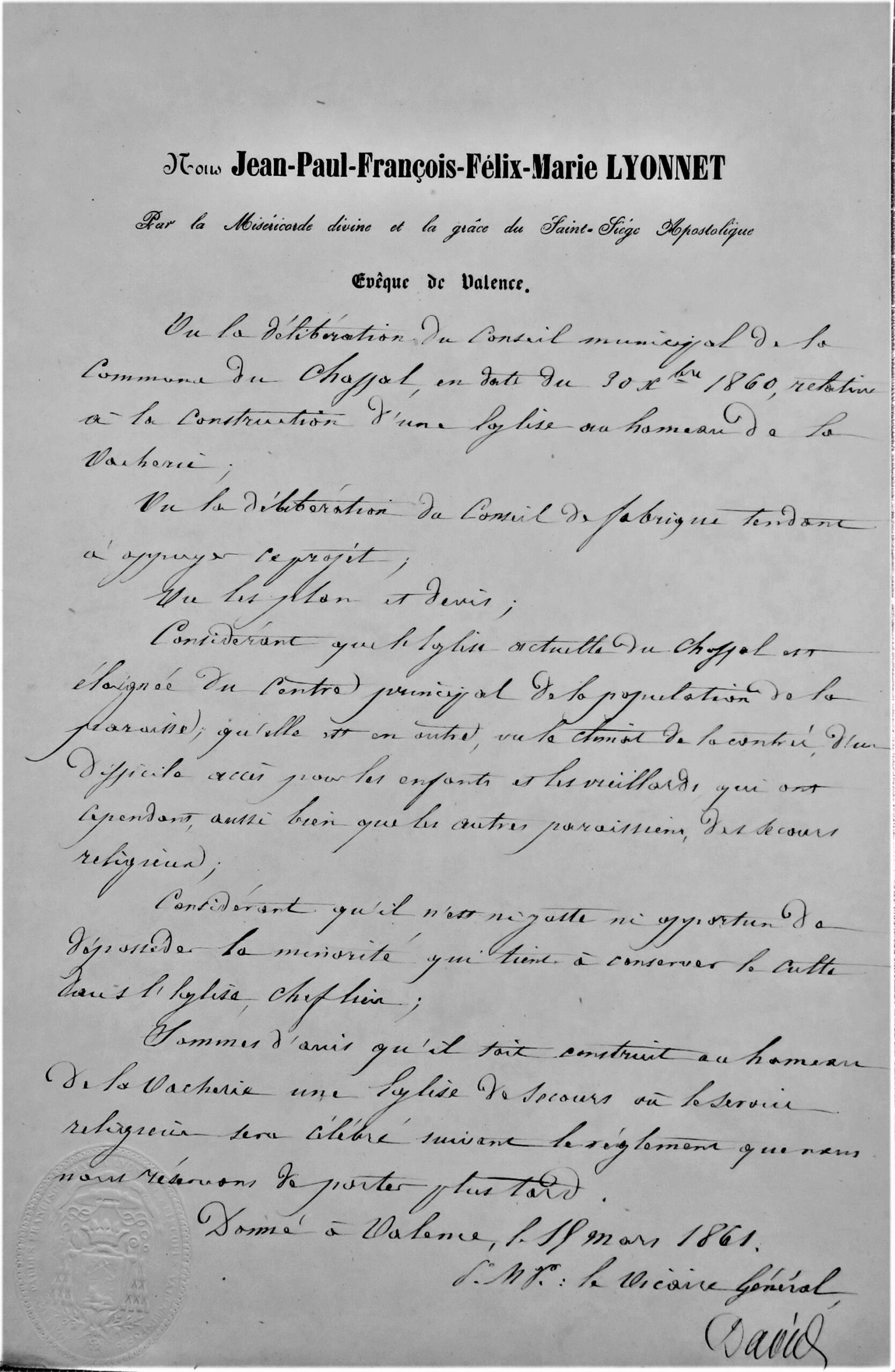 L’avis de Mgr Lyonnet favorable à la construction d’une église de secours, 15 mars 1861 (ADD 2 O 169)