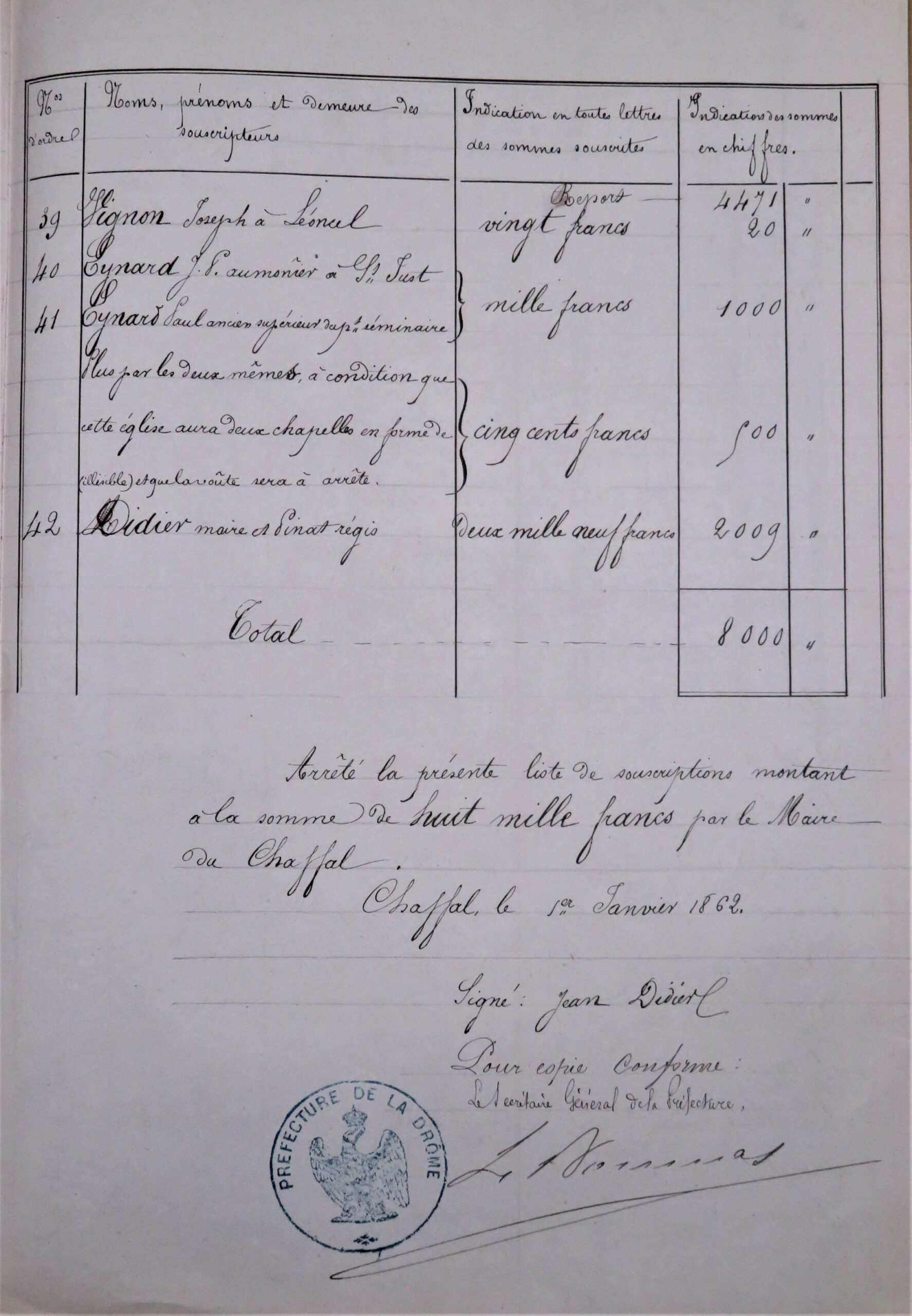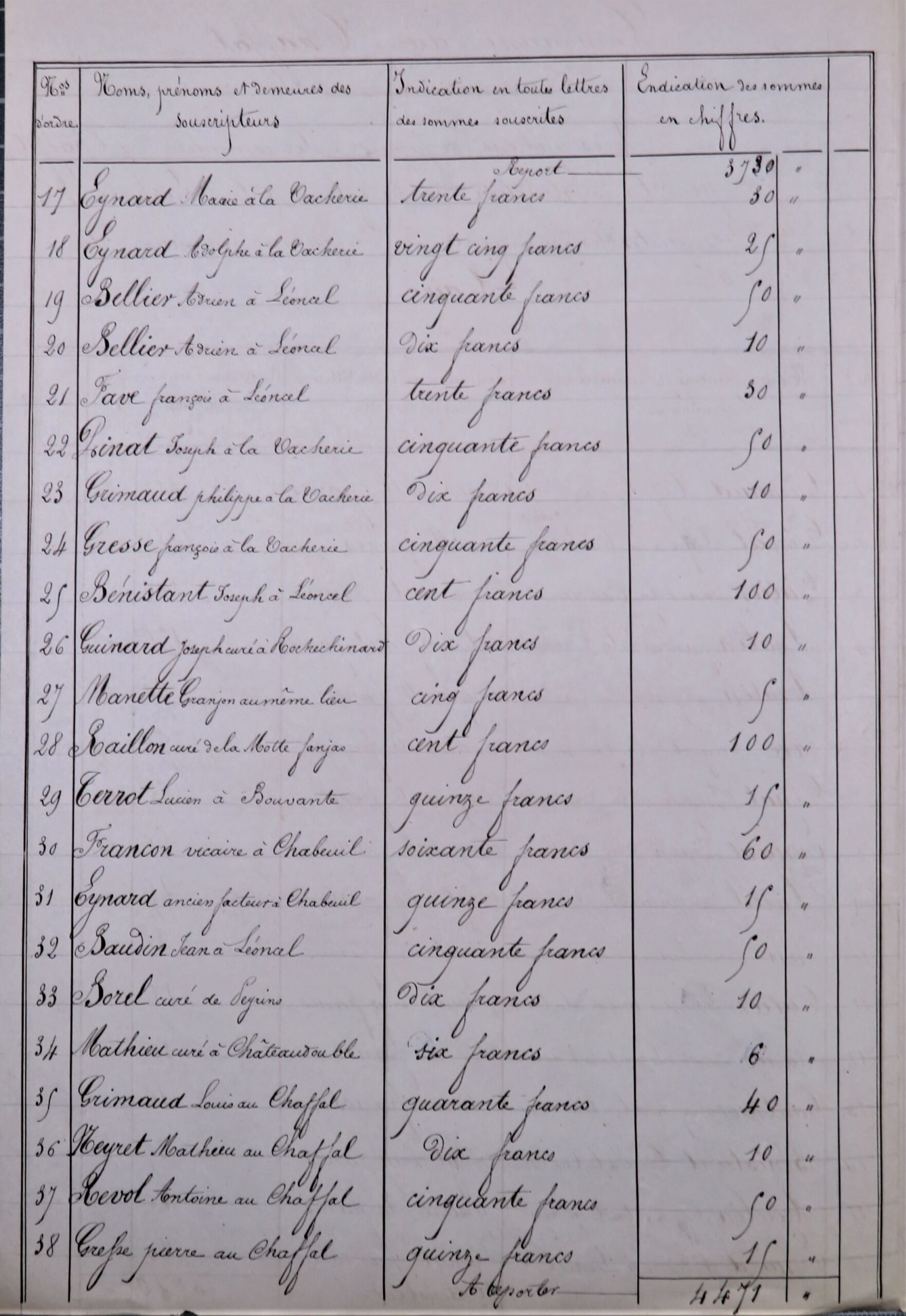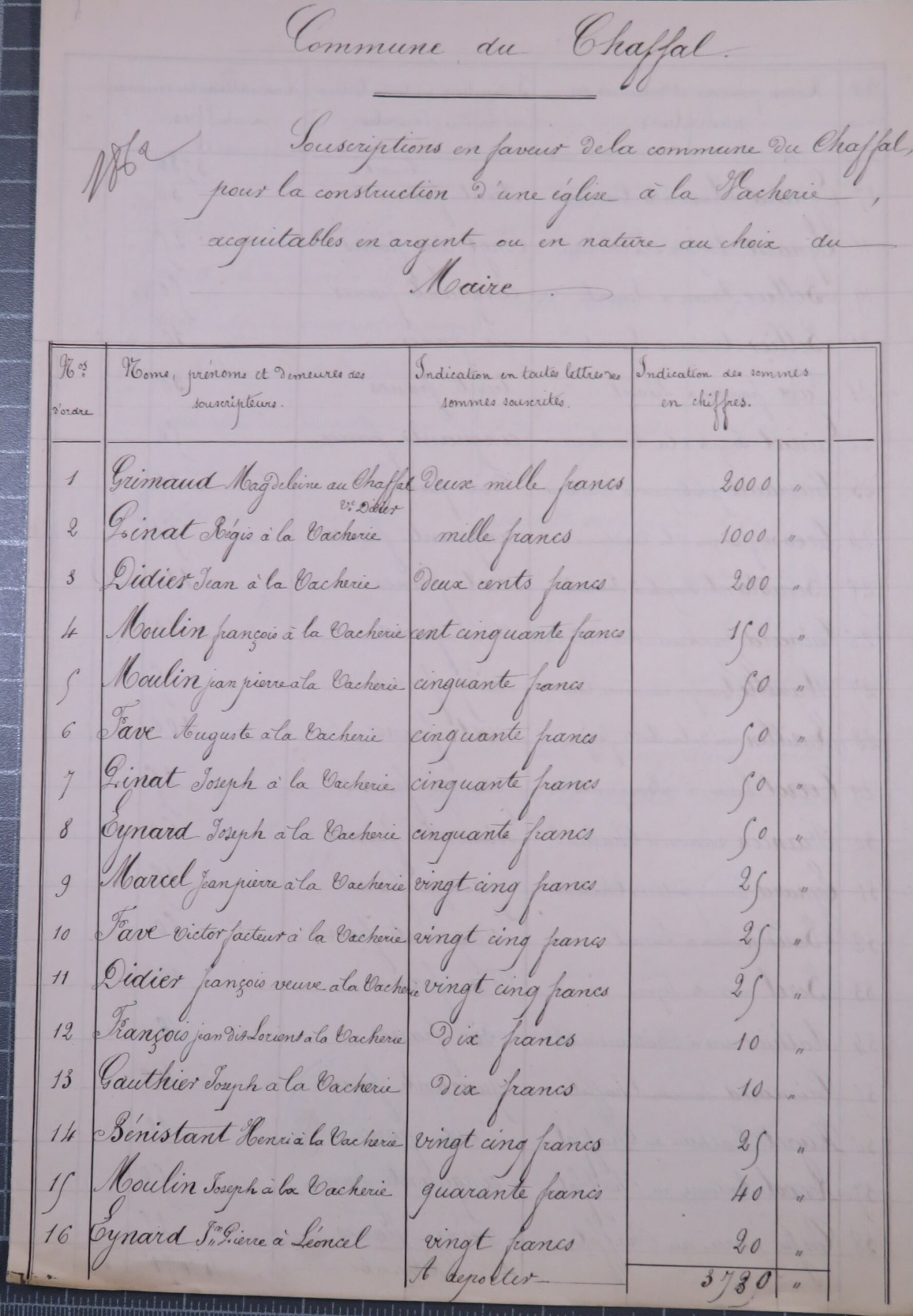 Une souscription est lancée, 42 paroissiens du Chaffal et des communes voisines rassemblent la somme de 8 000 F.