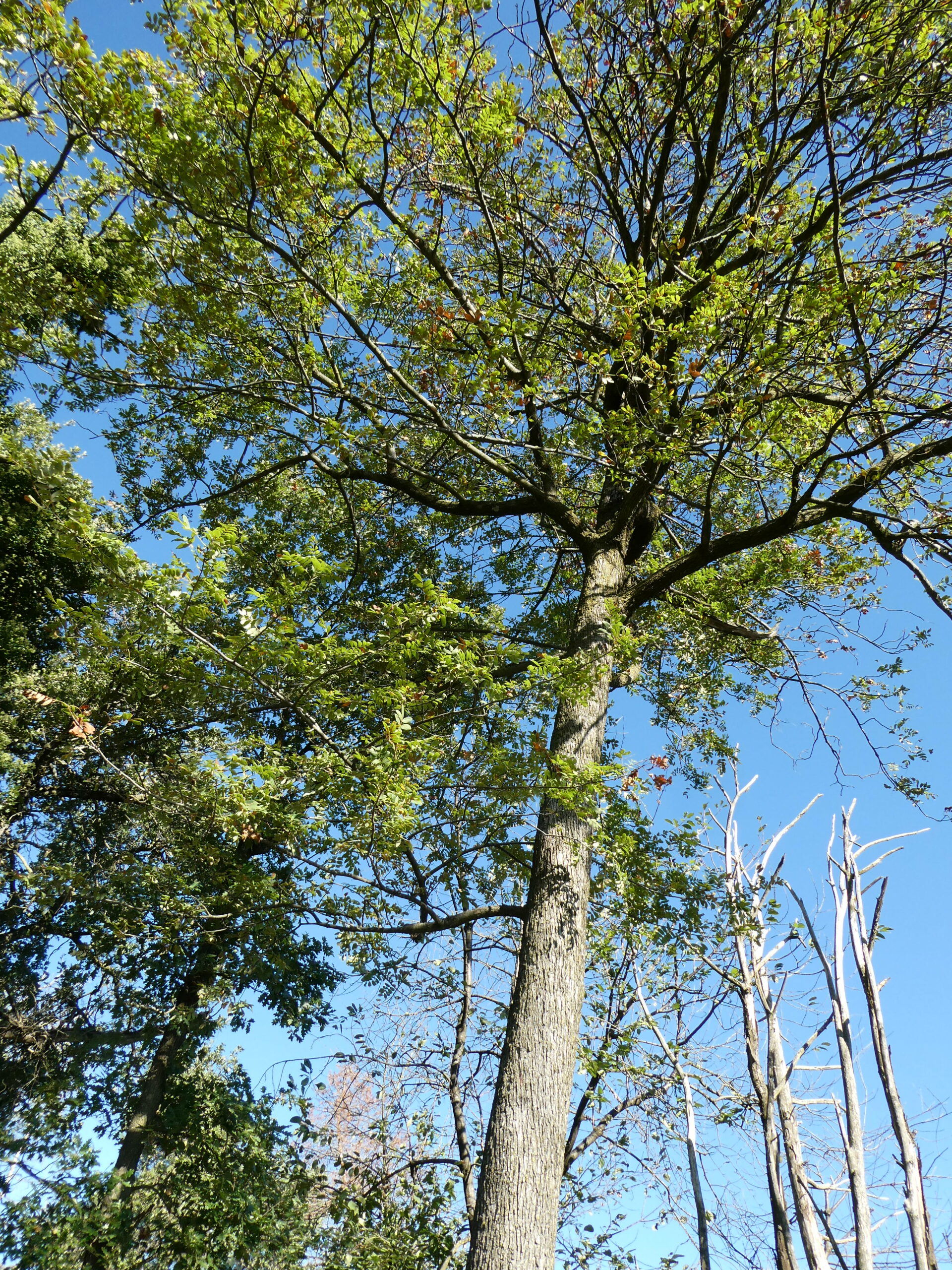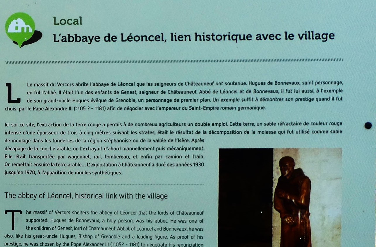 Les concepteurs du chemin rappellent le lien entre Châteauneuf et Léoncel, par la personne de Hugues de Châteauneuf, abbé de Léoncel puis de Bonnevaux (voir les Cahiers de Léoncel n° 27 et n° 28). De Châteauneuf, on voit distinctement la Tête Chauve et le col de Tourniol. On notera l’aspect desséché des branchages, à l’issue d’un été chaud et sec.