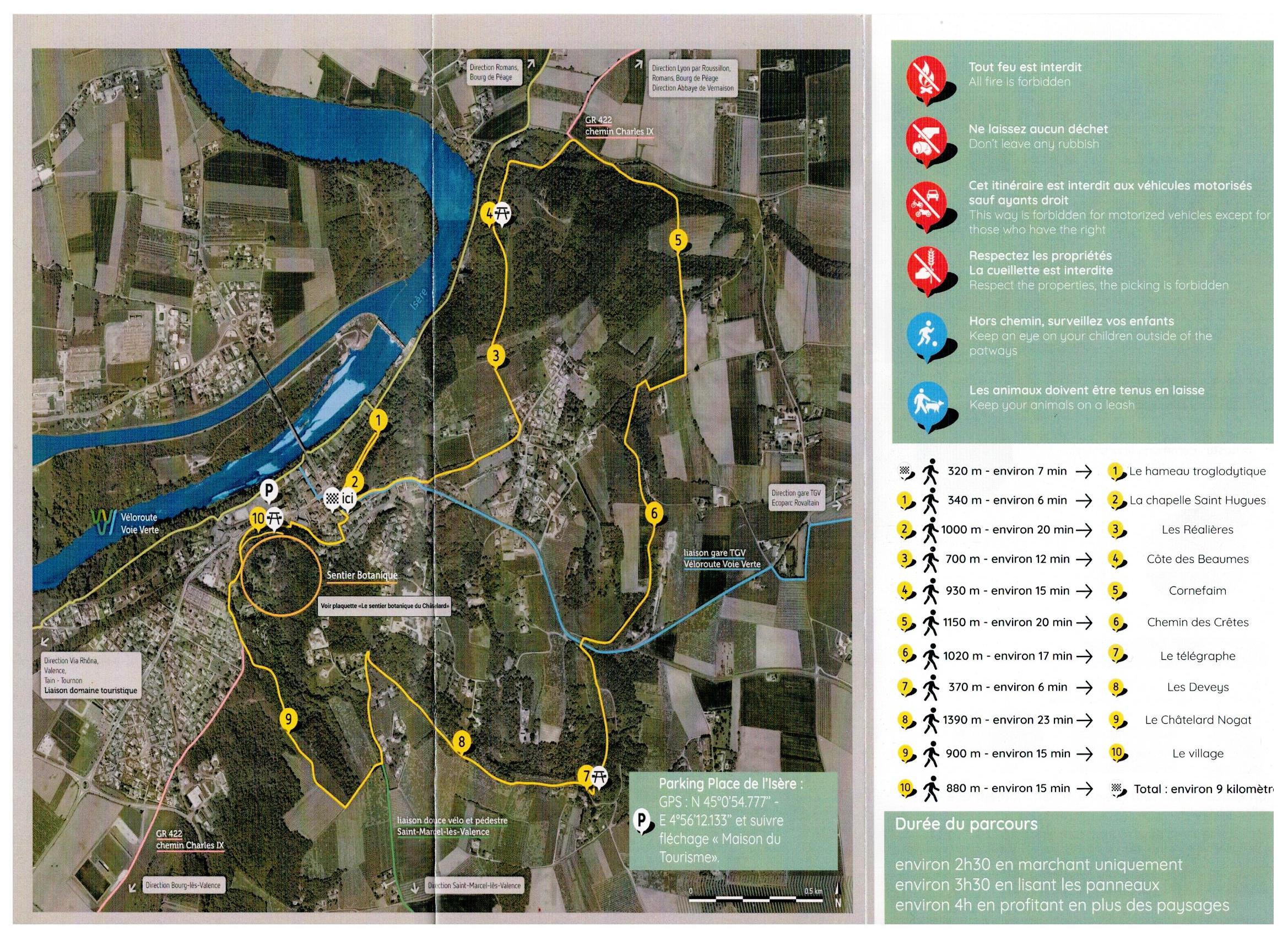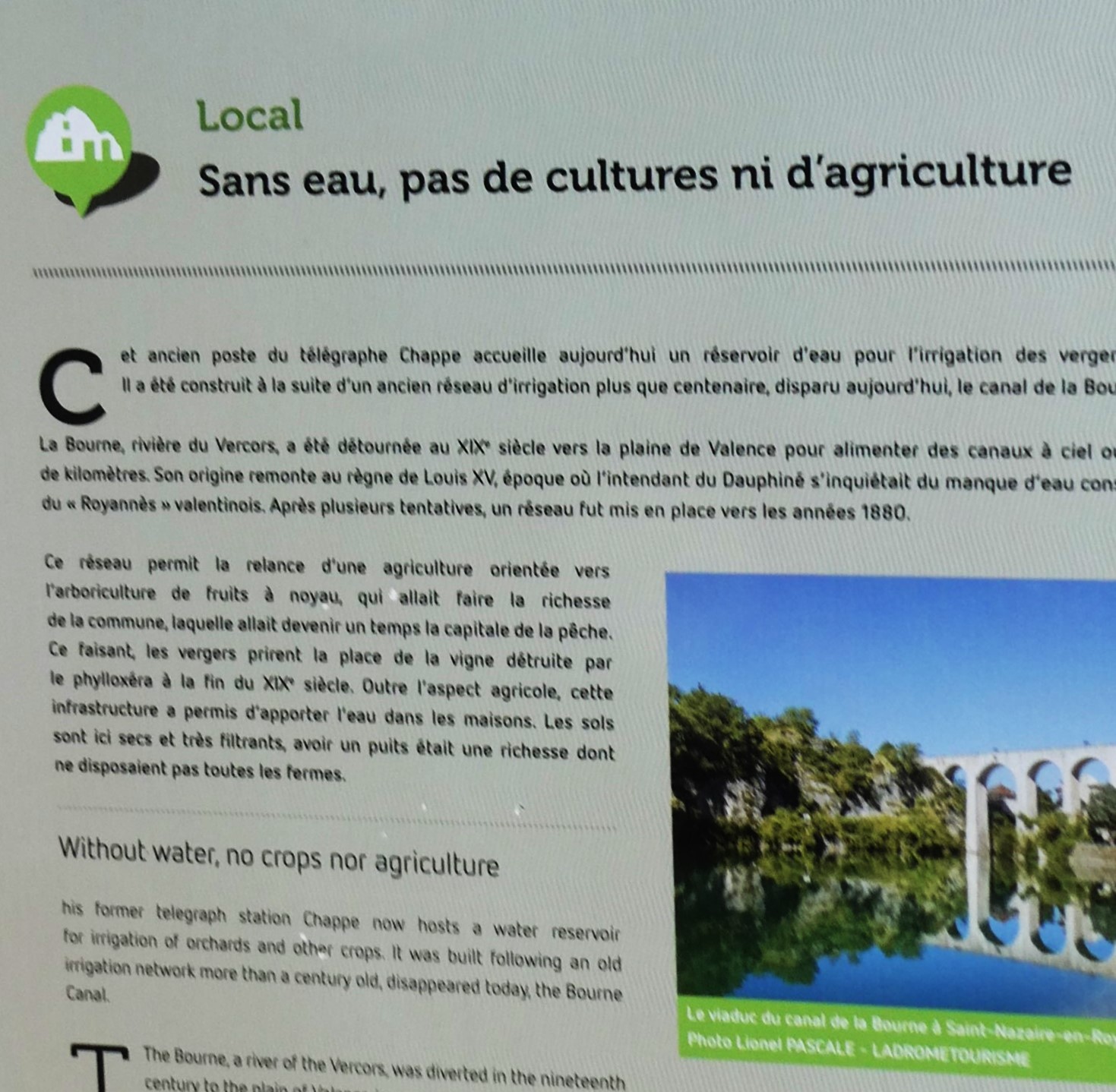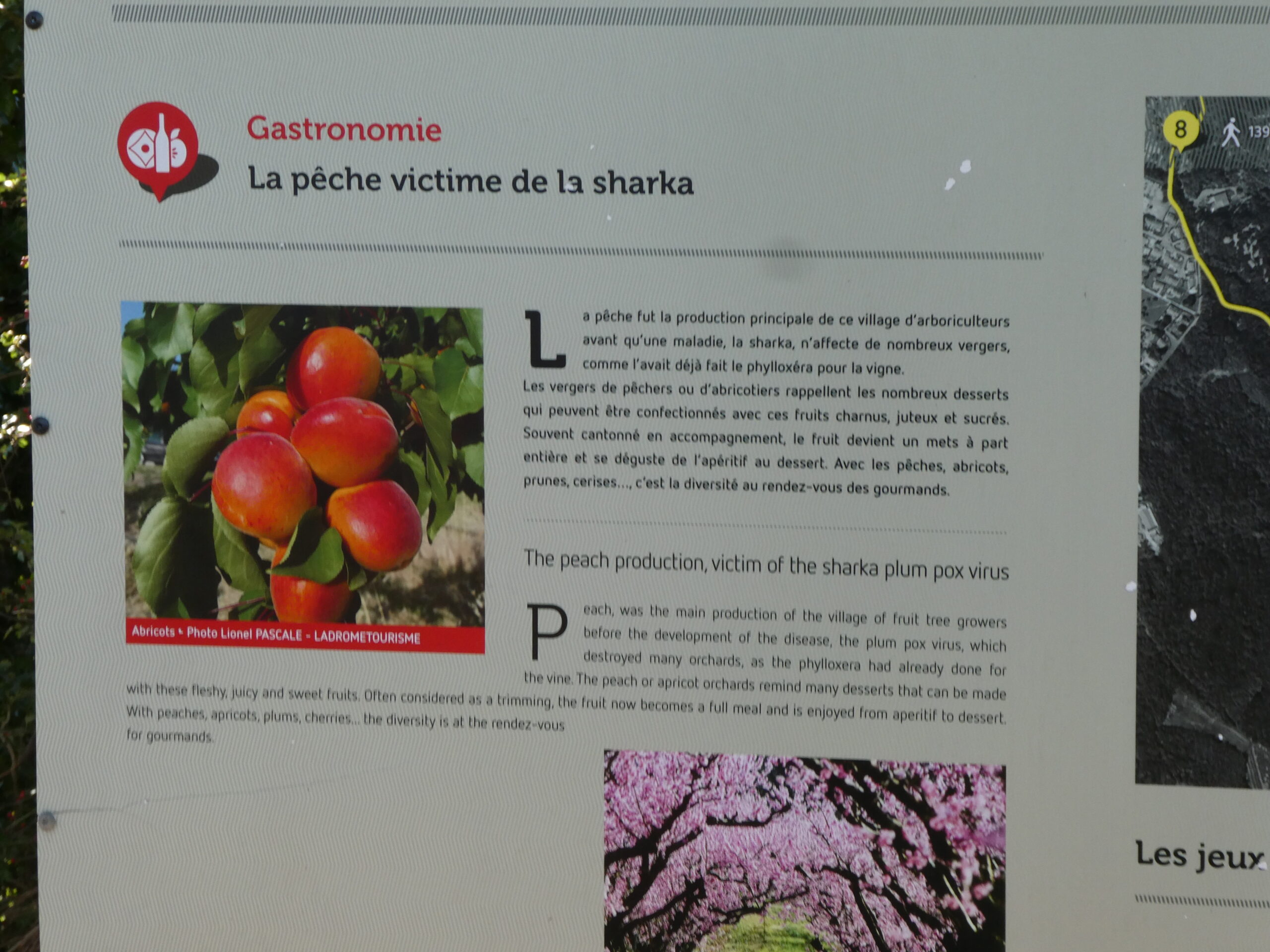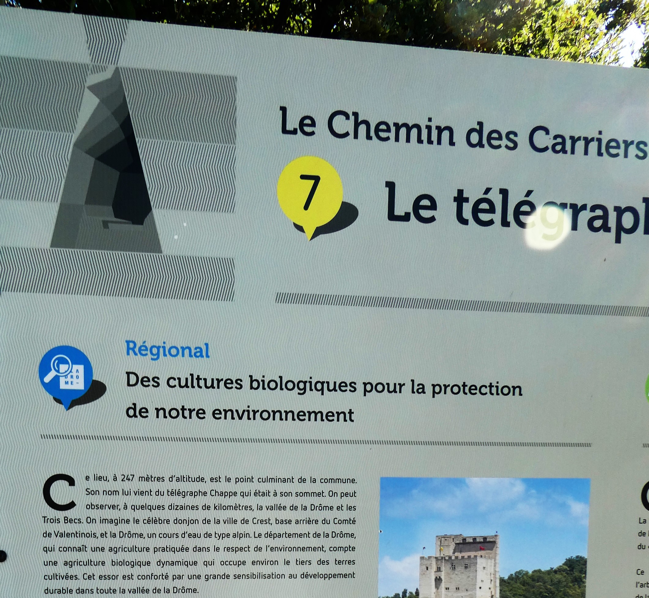 Le chemin des carriers passe dans les zones d’extraction de la molasse mais aussi dans les vergers nombreux : Châteauneuf est un centre d’arboriculture extrêmement actif. On appréciera le logo décorant les panneaux, stylisant les carrières de mollasse.