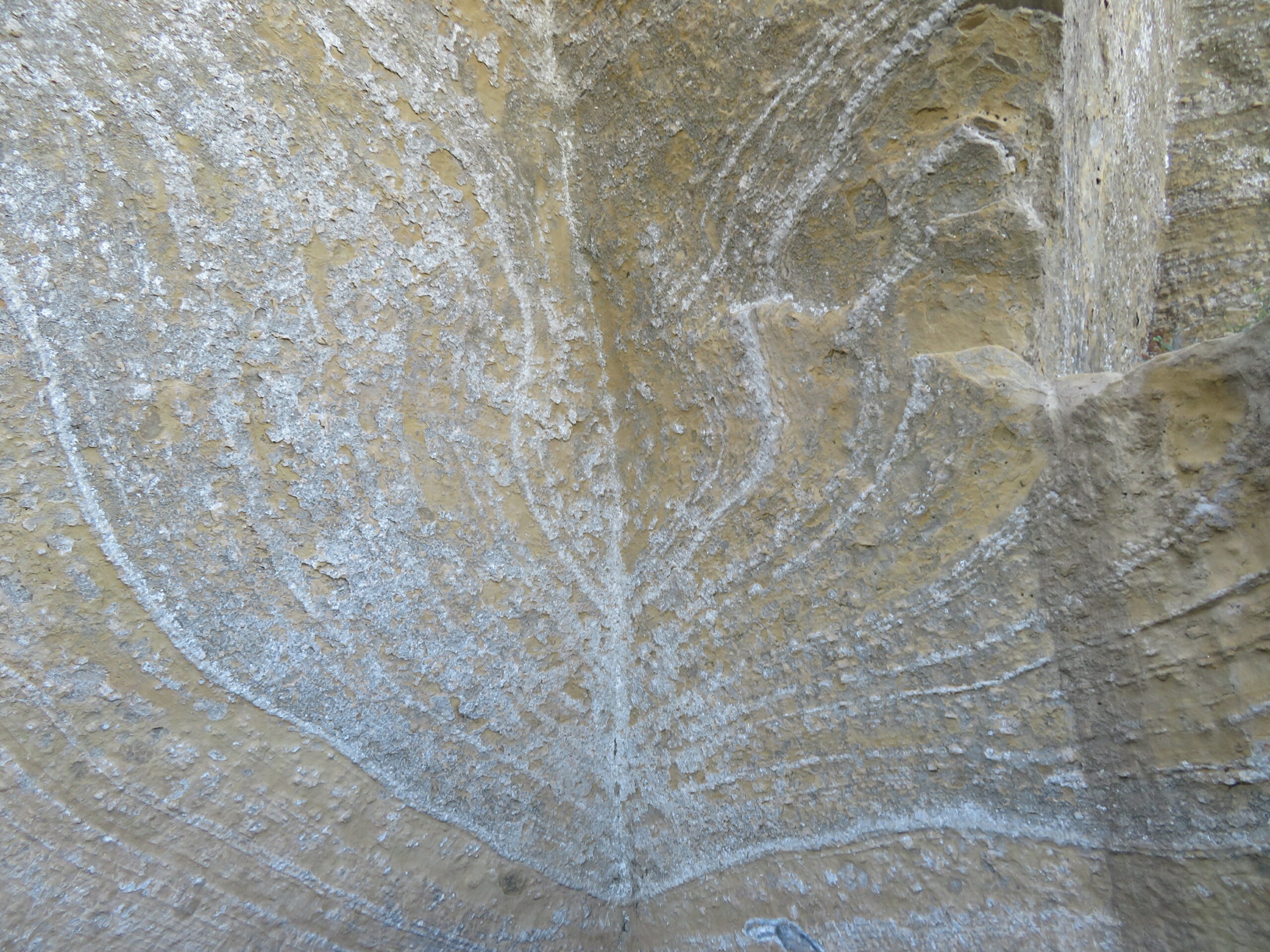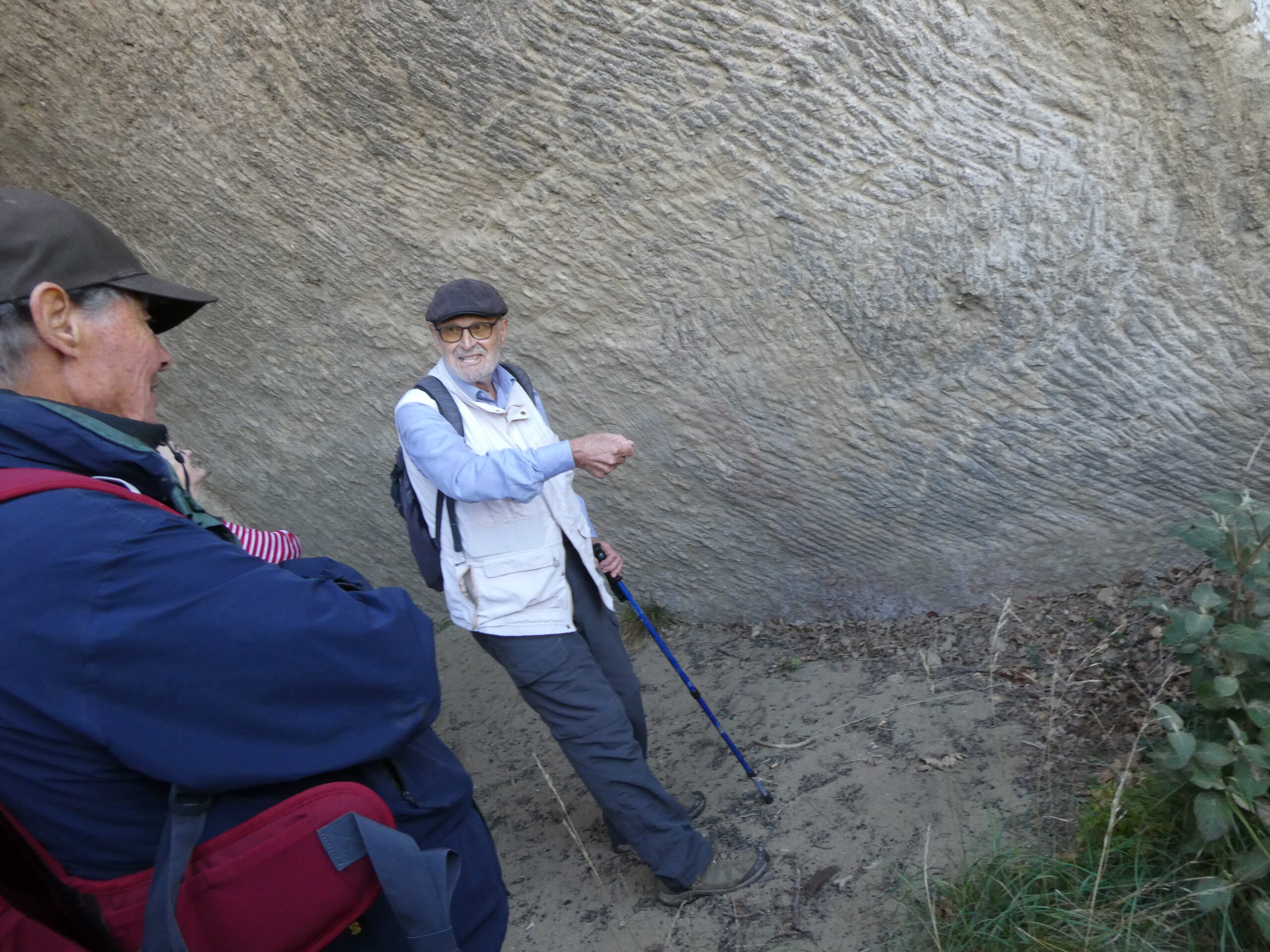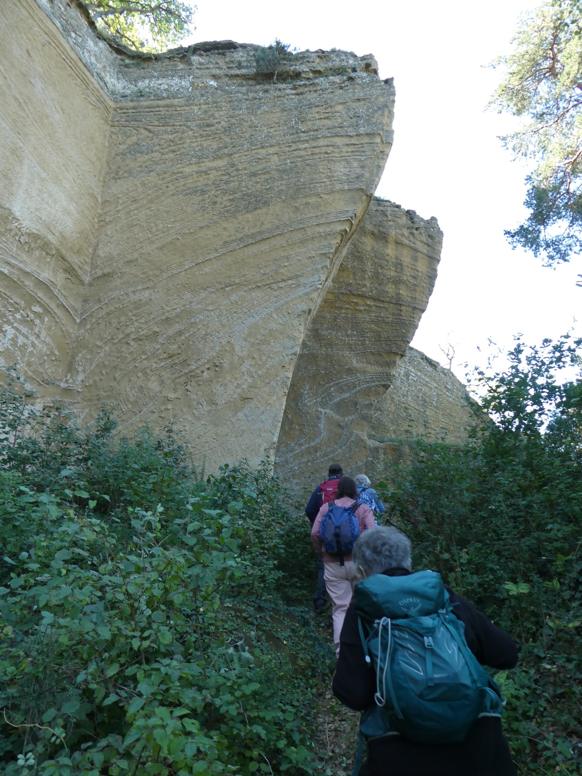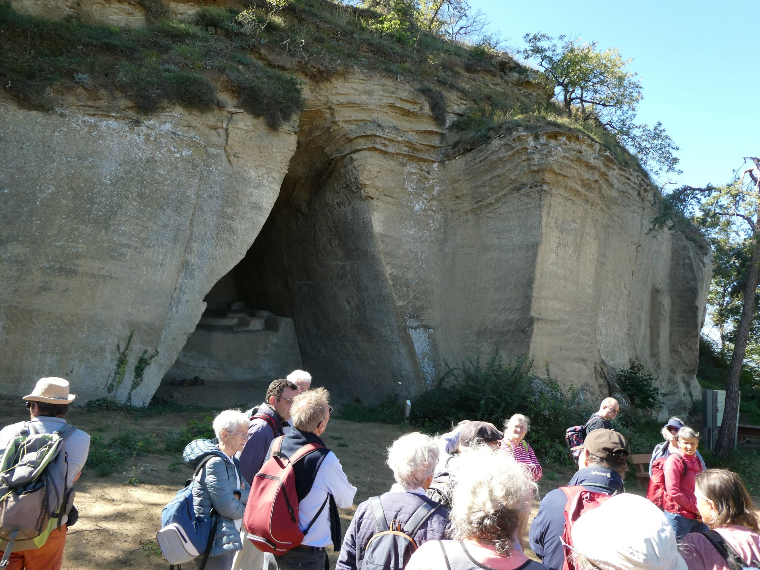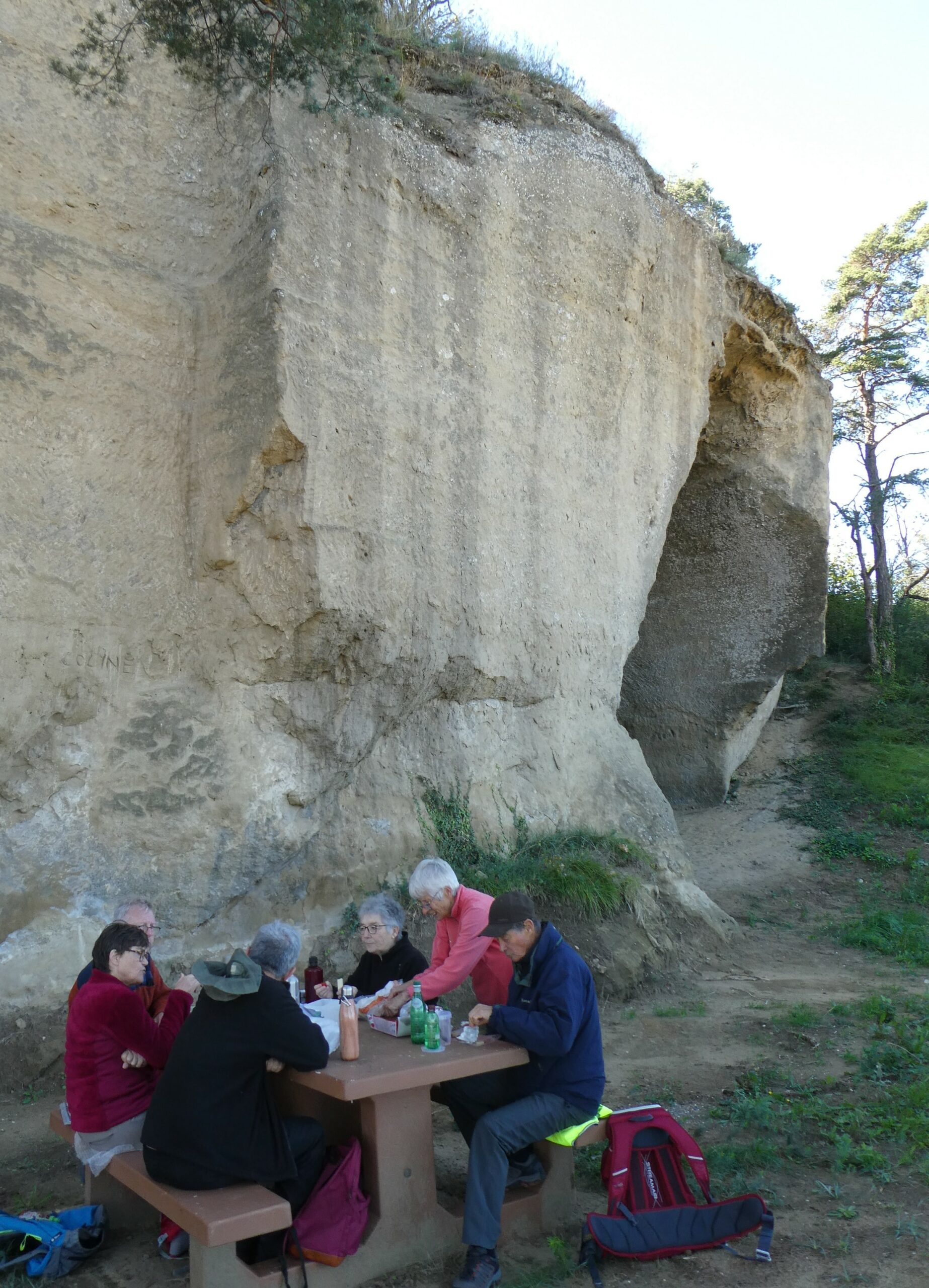 Repas tiré des sacs à l’entrée des carrières du Châtelard. Jean-Marc Vacher présente les modes d’exploitation de la molasse, amenant aux formes actuelles, puis explique, au pied du front de taille, la formation des bancs de pierre.