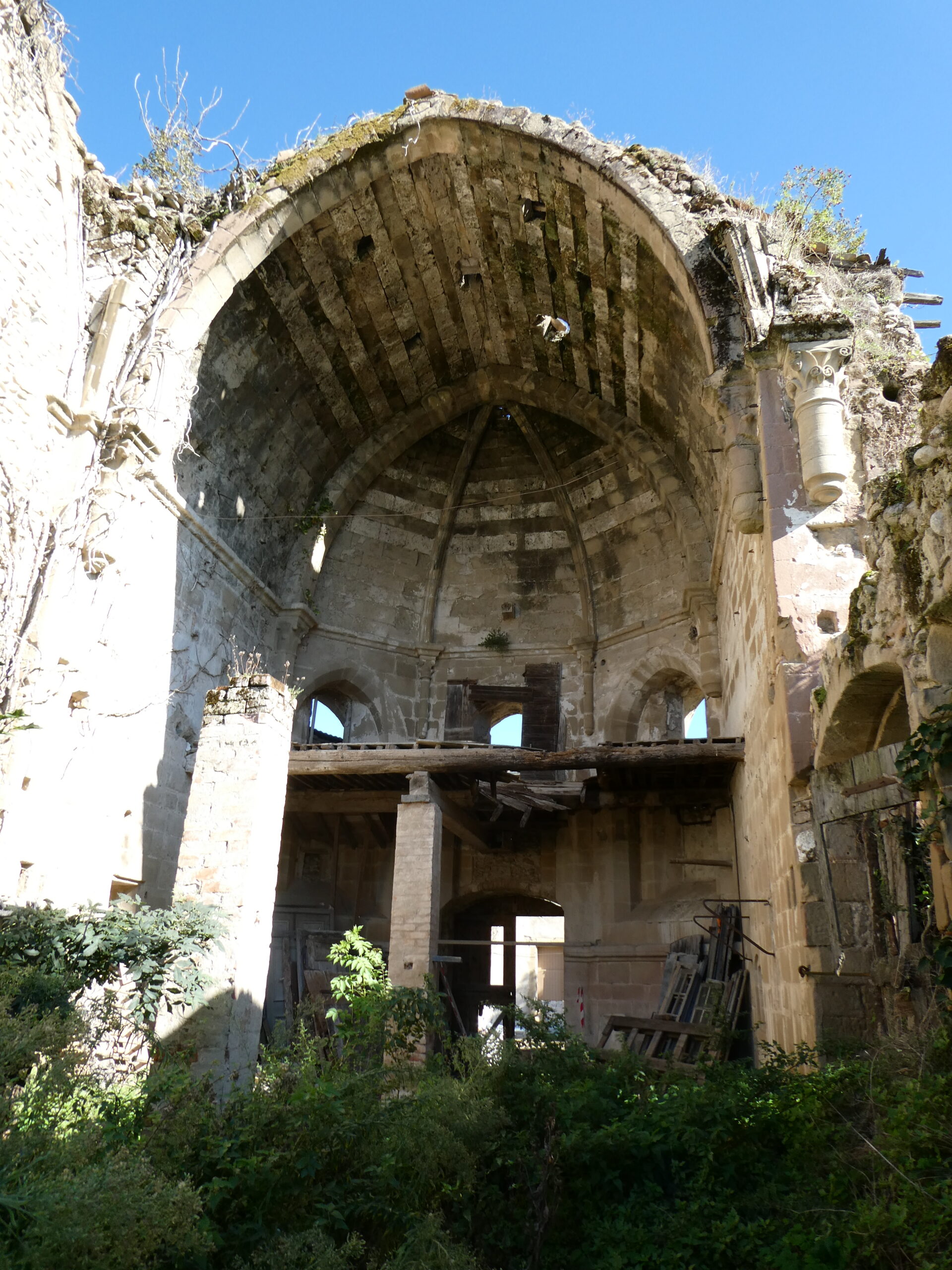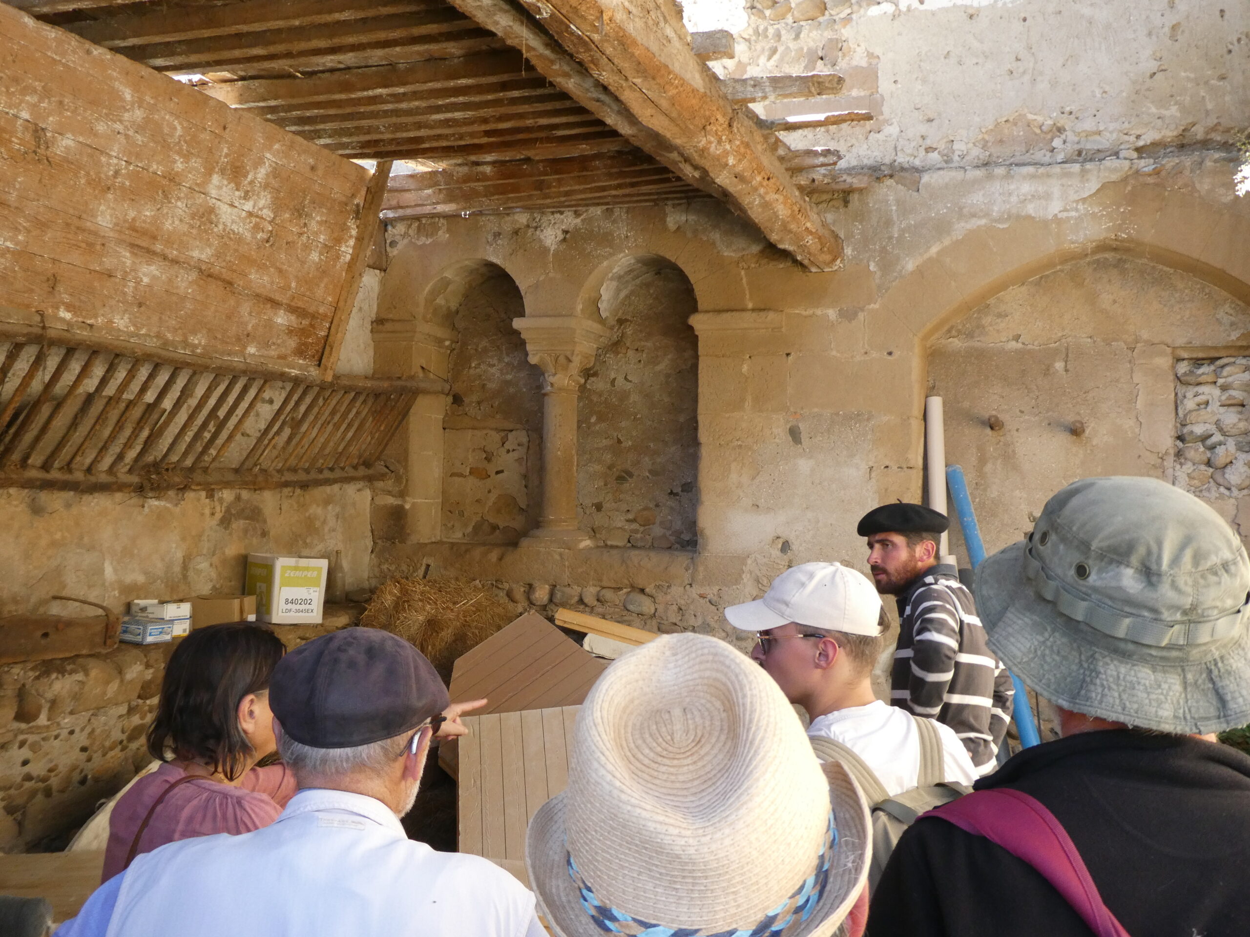 Tour de l’église. Lucas Bobillon fait remarquer différents détails architecturaux, ouvrant la discussion sur l’interprétation de tels ou tels éléments. La voute alterne molasse et tuf, pour un effet esthétique marqué. Deux chapiteaux sont encore en place.