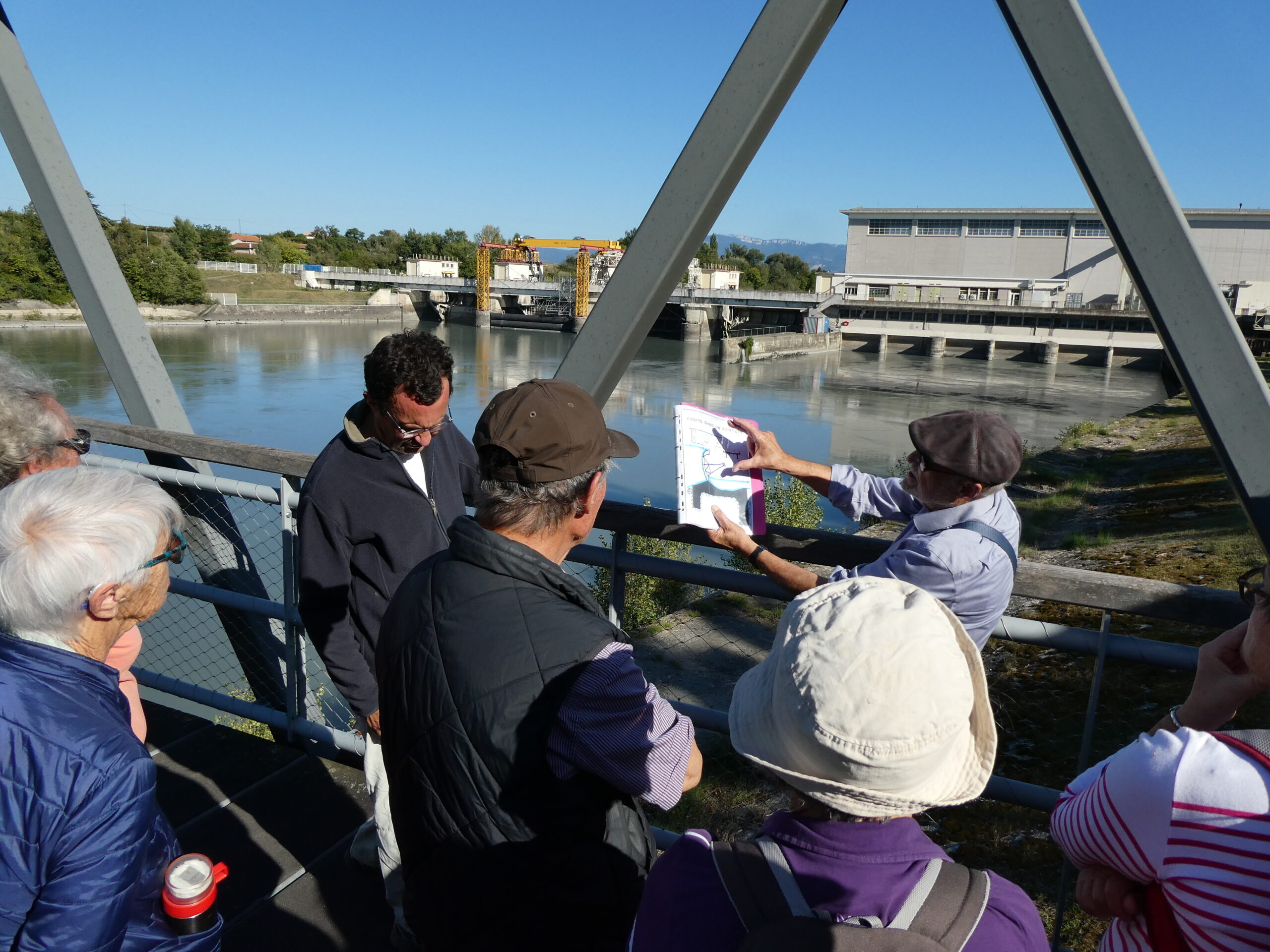 La dernière étape de la journée se fait à La Vanelle, lieu-dit où s’est édifié un barrage sur l’Isère, dans l’immédiat après-guerre. Jean-Marc Vacher explique les étapes de domestication de la basse Isère, créant un paysage inconnu jusqu’alors, participant à l’électrification de la région et à l’irrigation du territoire.