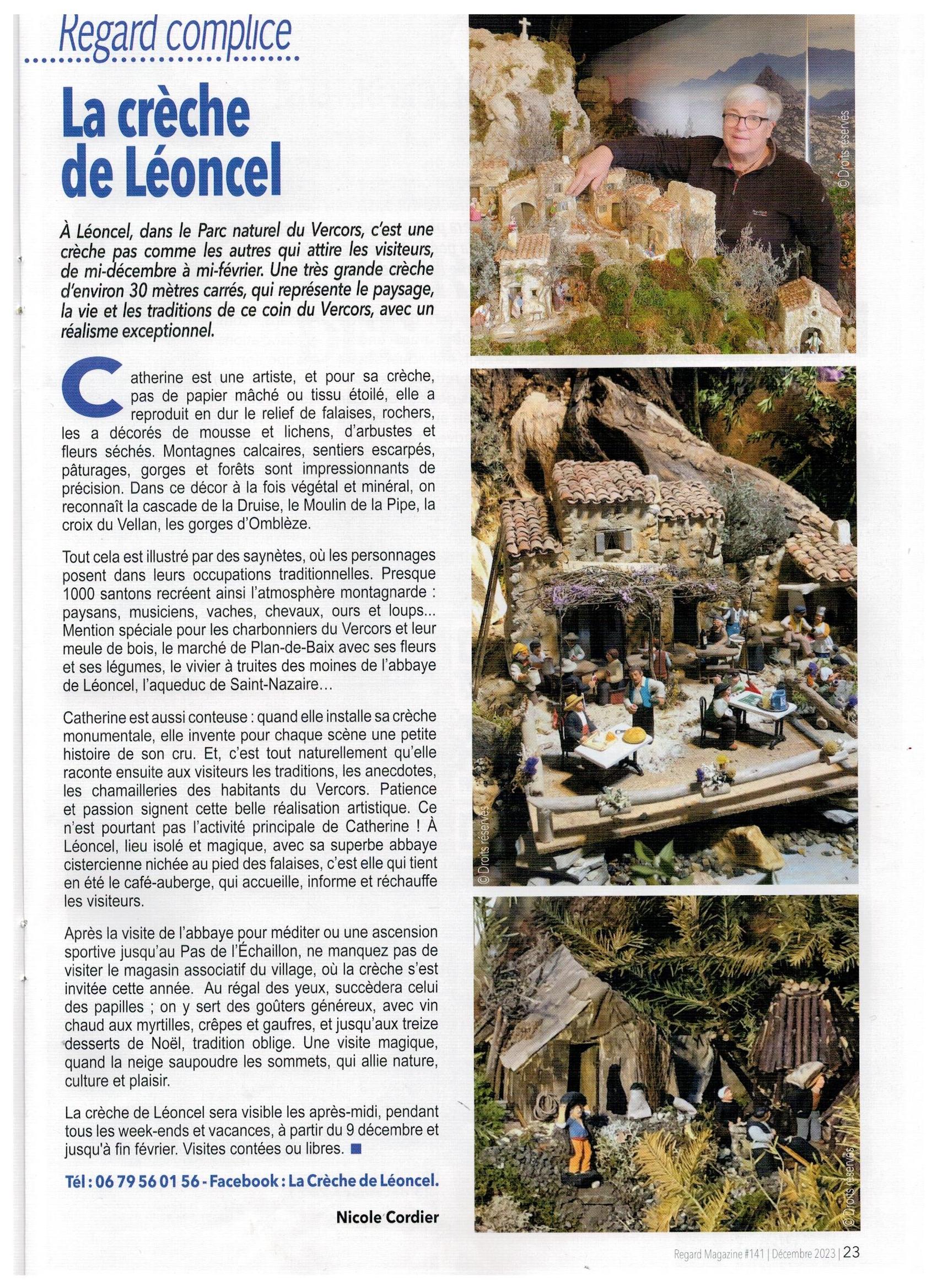 La neige est capricieuse, mais la crèche est fidèle : Catherine Mackowiak a remonté son oeuvre annuelle prodigieuse, cette année exposée au Magasin de Léoncel. Ci-dessous un article de Nicole Cordier, dans Regard, décembre 2023. La crèche est visible jusqu’à la fin de février.