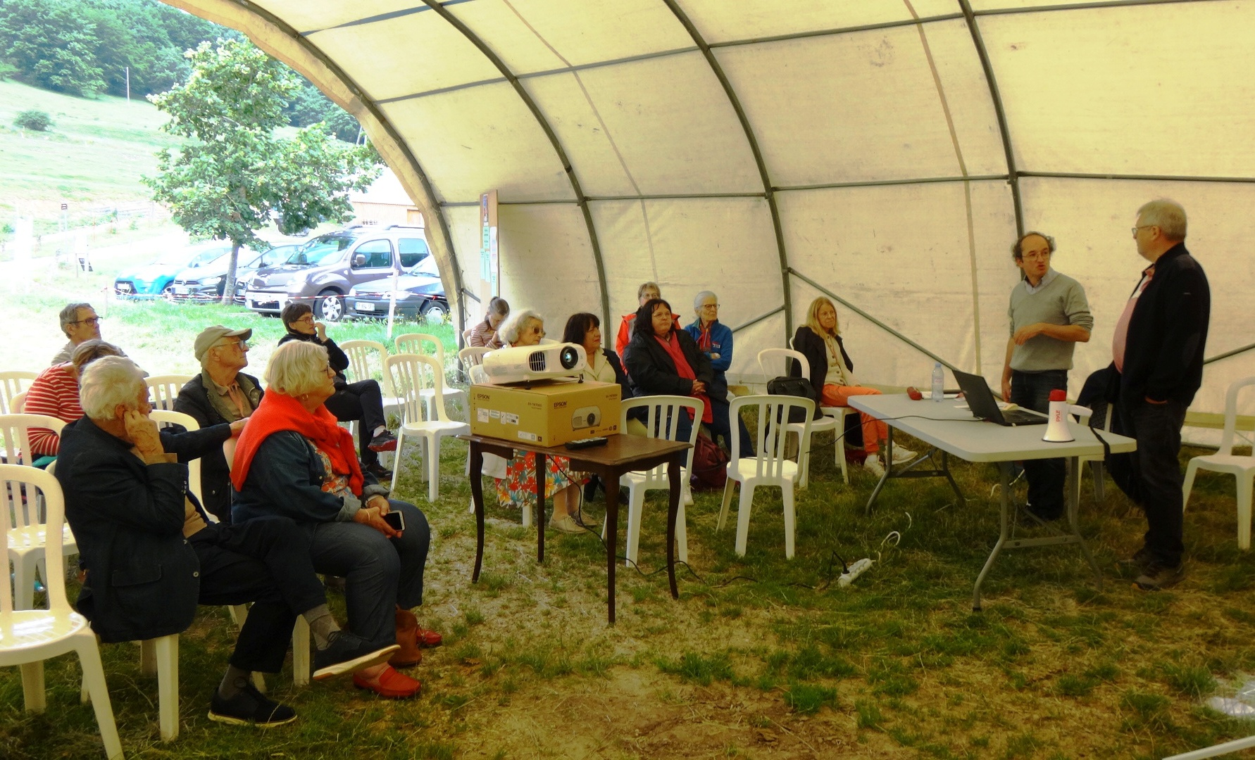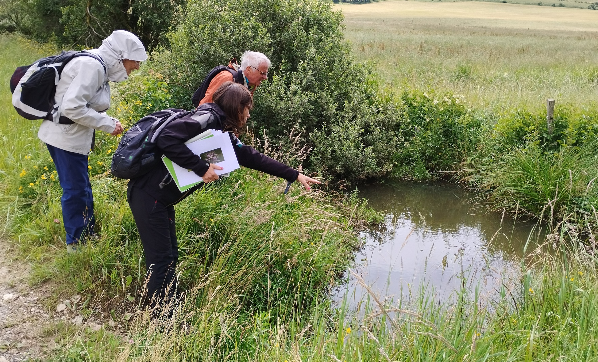 On voit sur cette photo deux personnes du Parc Naturel Régional du Vercors, qui avaient accepté de se déplacer, faire des commentaires sur le marais de Léoncel, une des rares zones humides du Vercors.