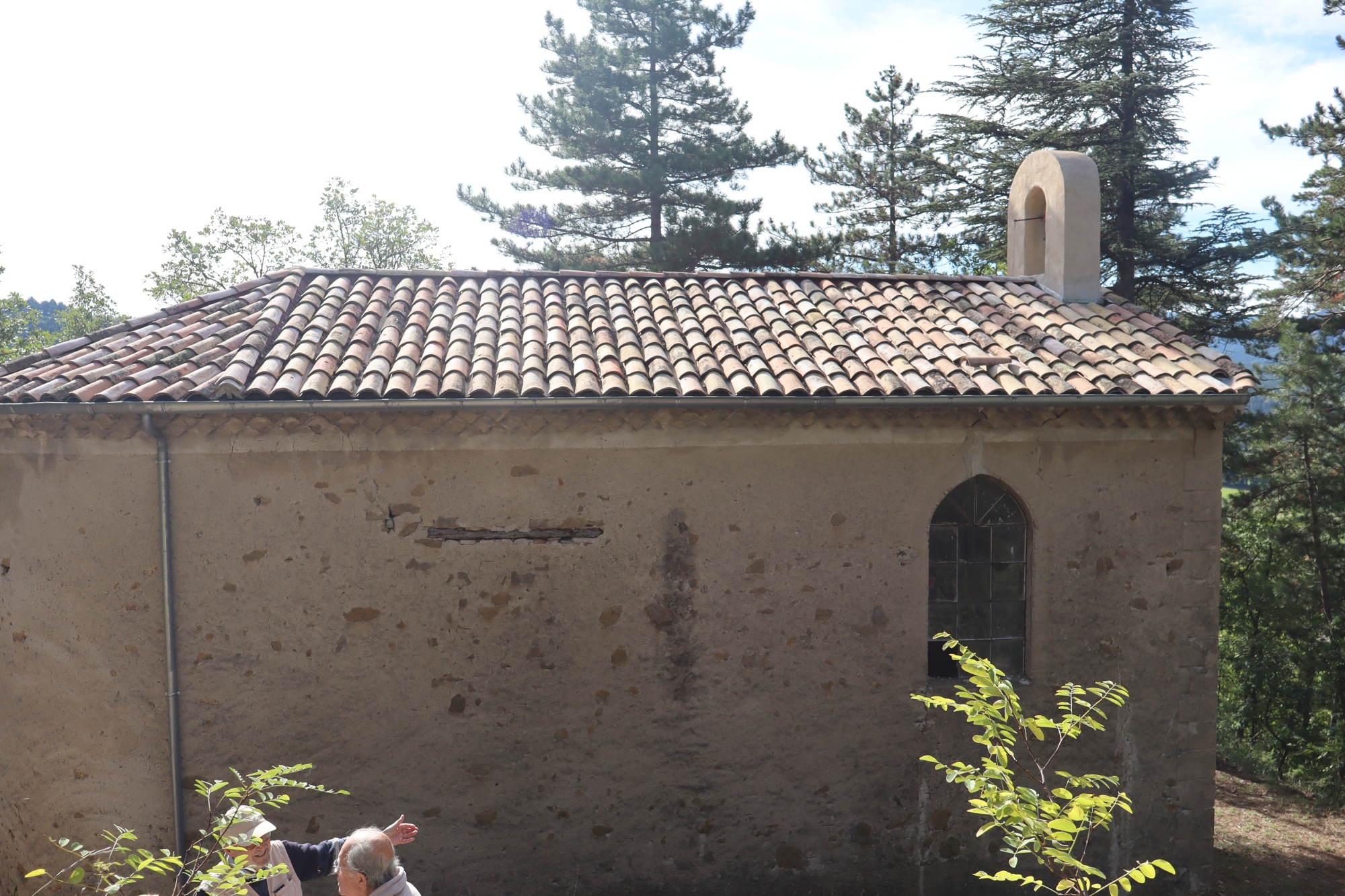 La matinée a été consacrée à la visite de la chapelle de Salières, située sur la commune de Die, en direction de l’ancienne abbaye de Valcroissant. Cette chapelle, restaurée par un couple de passionnés, a été construite pour desservir un centre de soins thermo-résineux au fonctionnement original. On utilisait en effet les vapeurs issues de la combustion de pin Mugho (ou pin à crochets), que l’on allait chercher sur les hauteurs du Glandasse, pour soigner des problèmes d’articulation en particulier (les prospectus émis au début du siècle laissent cependant entendre que cela soignait un peu tout!). Ce centre, original et novateur en France, a fonctionné de 1850 à 1972.